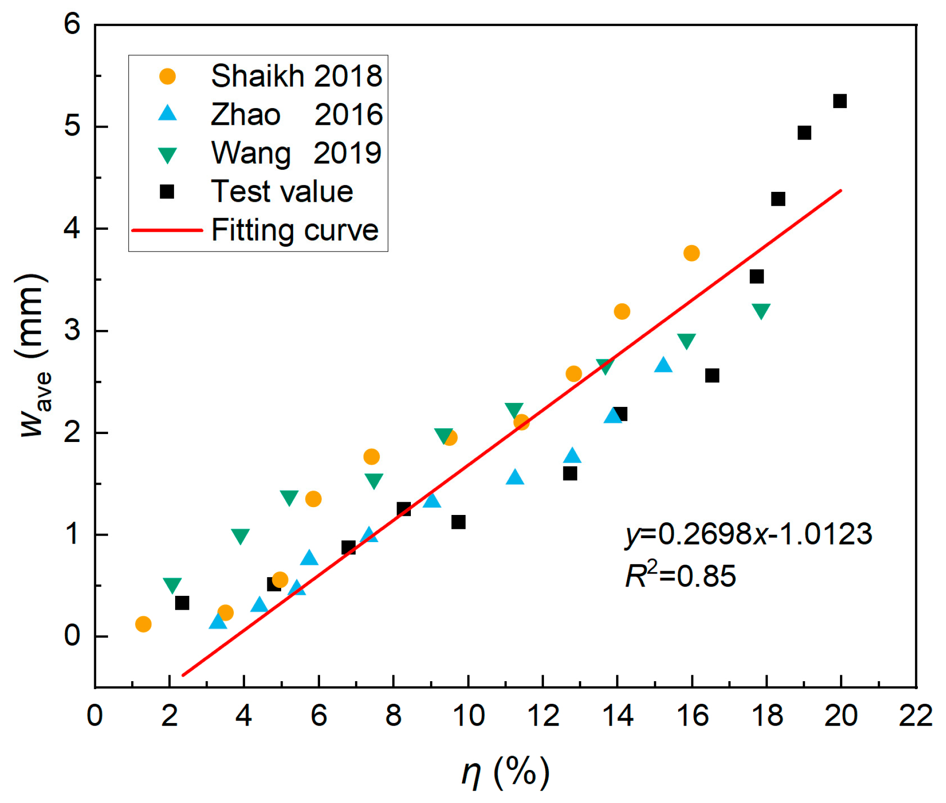 The assessment of the corrosion of the steel strands is an important part of the durability analysis and life prediction of prestressed concrete structures in service. Some researchers conducted corrosion cracking tests on reinforced concrete specimens and concluded that there was a certain relationship between the width of concrete cracks and the corrosion rate of reinforcing bars. Therefore, based on the test results and existing research, the relationship between the average crack width of the specimens and the corrosion rate of the steel strands was analyzed, as shown in Figure 6.