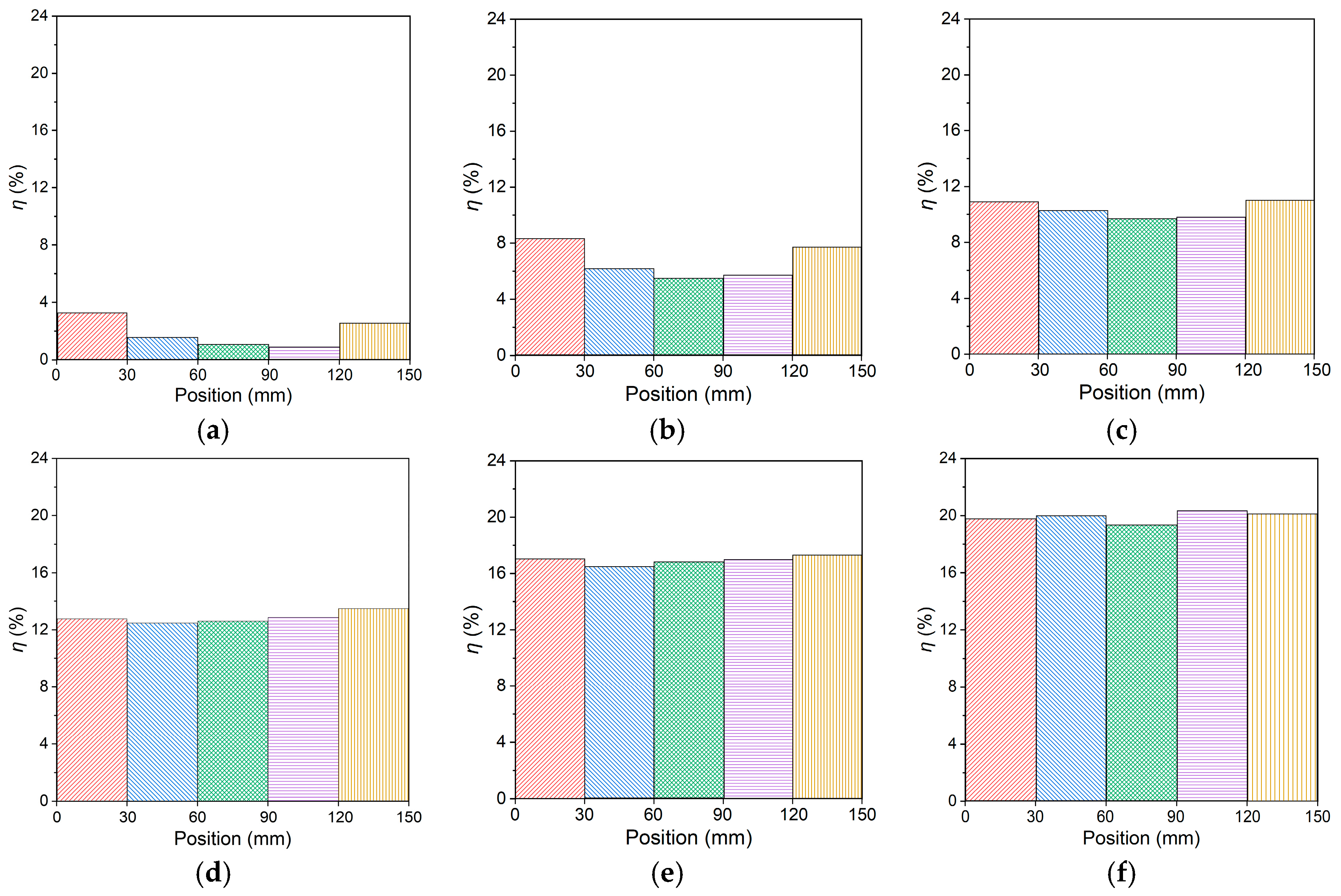 In order to analyze the corrosion rates of steel strands at different positions after electrochemical corrosion, six groups of steel strand samples were selected with corrosion differences after the corrosion test. The steel strands in the corrosion area were evenly divided into five sections, and the corrosion rate of each section was tested in accordance with the specifications. The corrosion rates of the steel strands at different positions in the corroded area are shown in Figure 7.