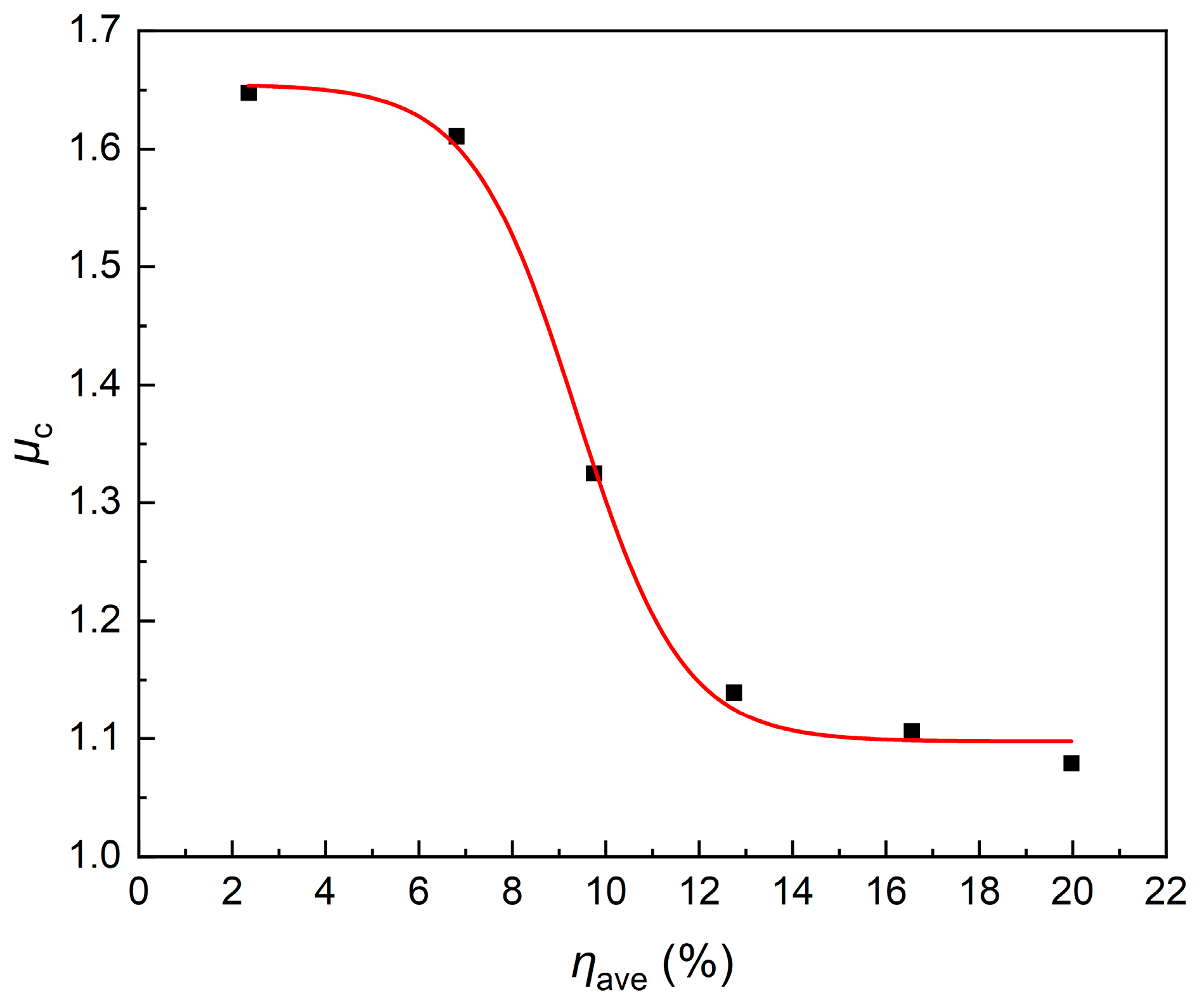 where ηmax is the maximum corrosion rate of the steel strand along its length, and ηmin is the minimum corrosion rate along the length of the steel strand. The relationship between the average corrosion rate ηave and the corrosion difference coefficient μ of the steel strand is shown in Figure 8.
