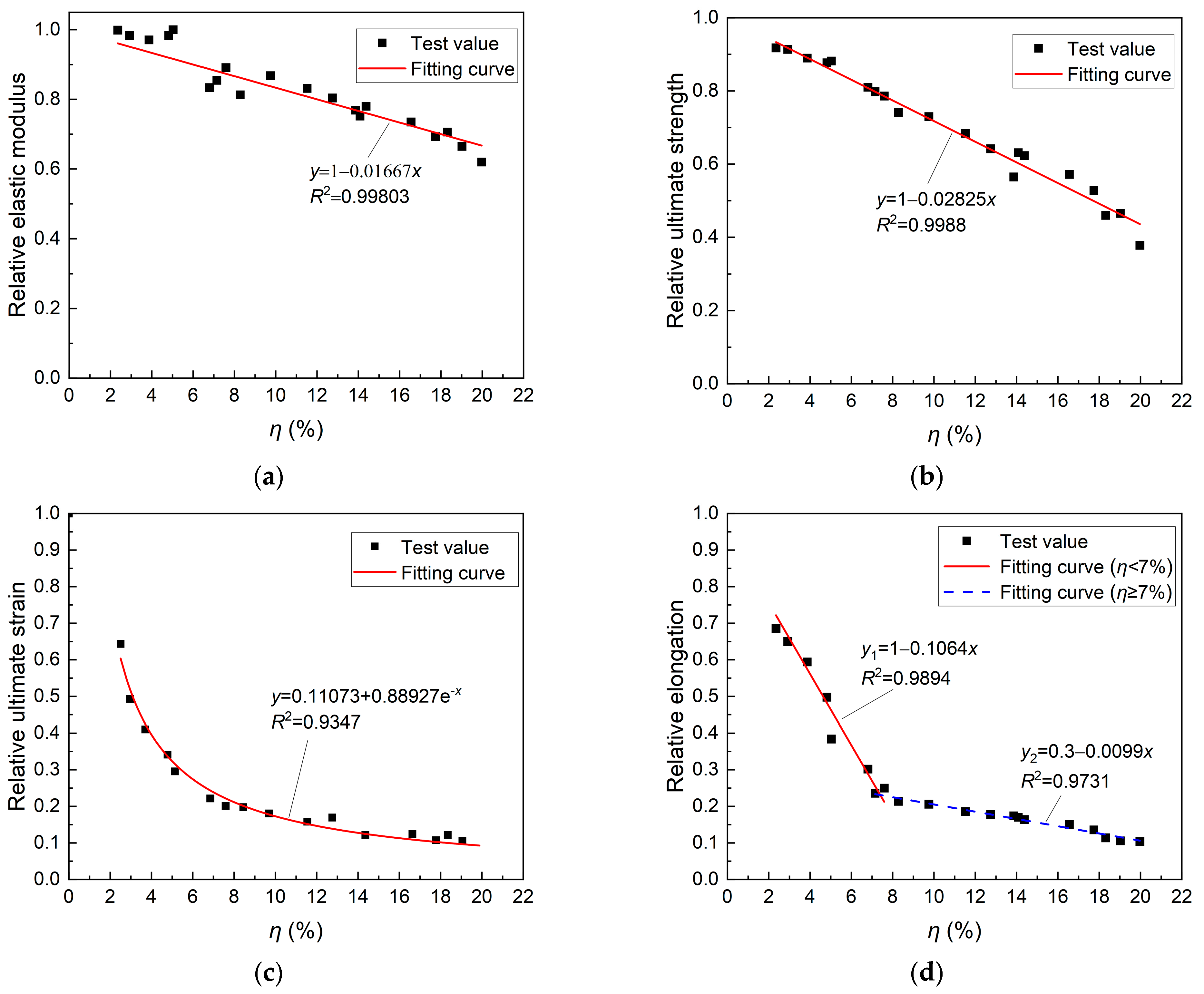 To compare the effects of different stray current corrosion levels on the mechanical properties of the steel strands, stress–strain curves of the steel strands within gauge lengths at different corrosion rates through tensile tests were created, as shown in Figure 9b. When the corrosion rate increased to 7.59%, the ultimate strength of the corroded strands decreased by 21.4% compared with that of the uncorroded strands. When the corrosion rate increased to 15.86%, the ultimate strength of the steel strand decreased by 42.8%. It can be observed that the ductility of the steel strand, characterized by uniform elongation, decreases as the corrosion rate increases. The yield platform and strain hardening zone of the stress–strain curve gradually decrease with increasing corrosion rate, disappearing when the corrosion rate is greater than 7%. This may be due to the changes in the metal lattice structure caused by corrosion, including the accumulation of dislocation grains and stress concentration on the single crystal grains, which leads to a shift in the failure mode from ductile failure with intergranular fracture to brittle failure with trans granular fracture. Therefore, the critical corrosion rate ηcrit can be introduced, which was set as 7% based on the test results. The changes in the mechanical properties of the corroded steel strands were analyzed, including changes in ductility, elastic modulus, and ultimate strength. Fitting curves for the mechanical properties were plotted based on the test results, as shown in Figure 10.