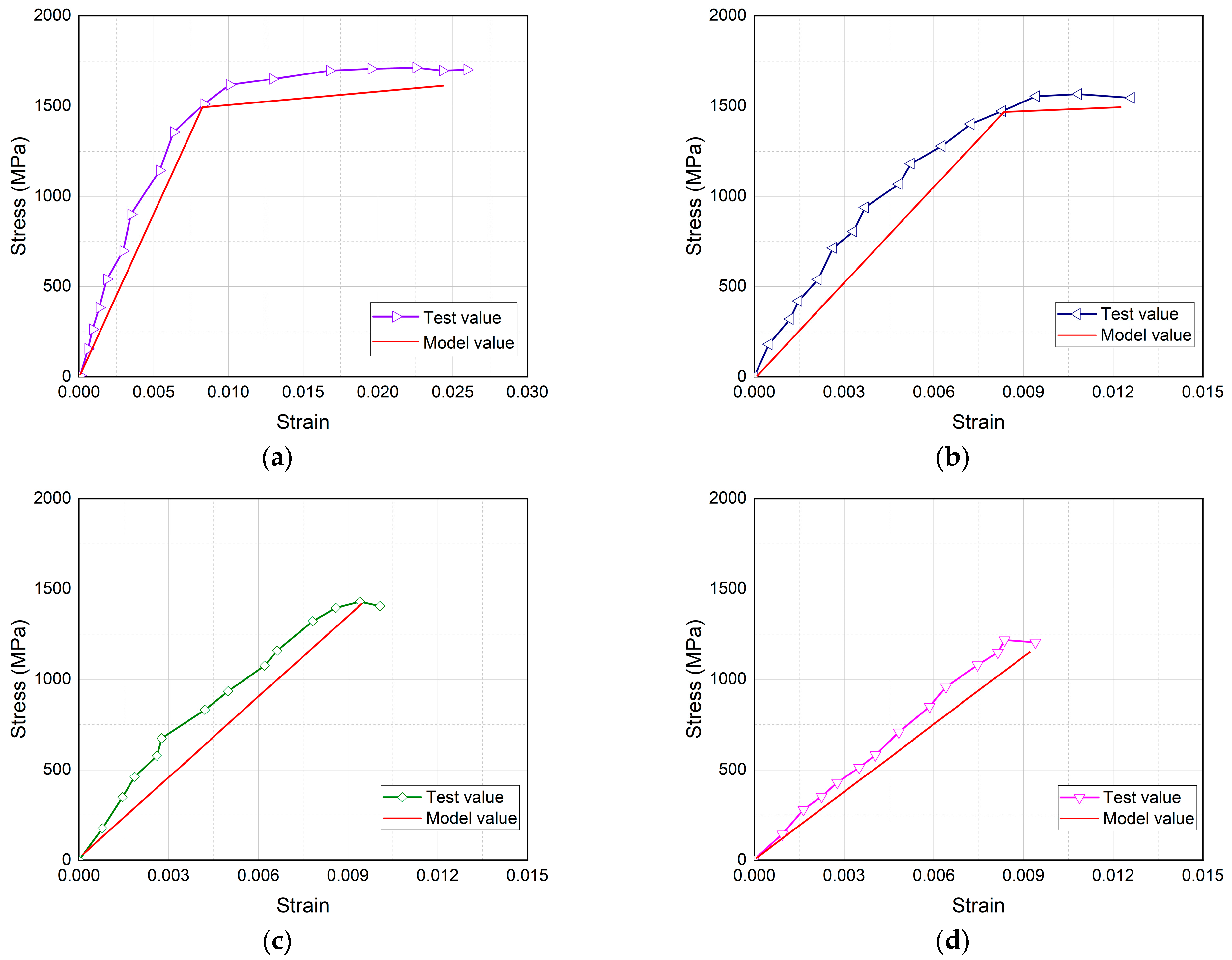 In this study, the stress–strain curves of the corroded steel strands obtained from the test were compared with the established constitutive model to verify applicability and accuracy. The results indicate that the model curves are in good agreement with the test results, as shown in Figure 12.