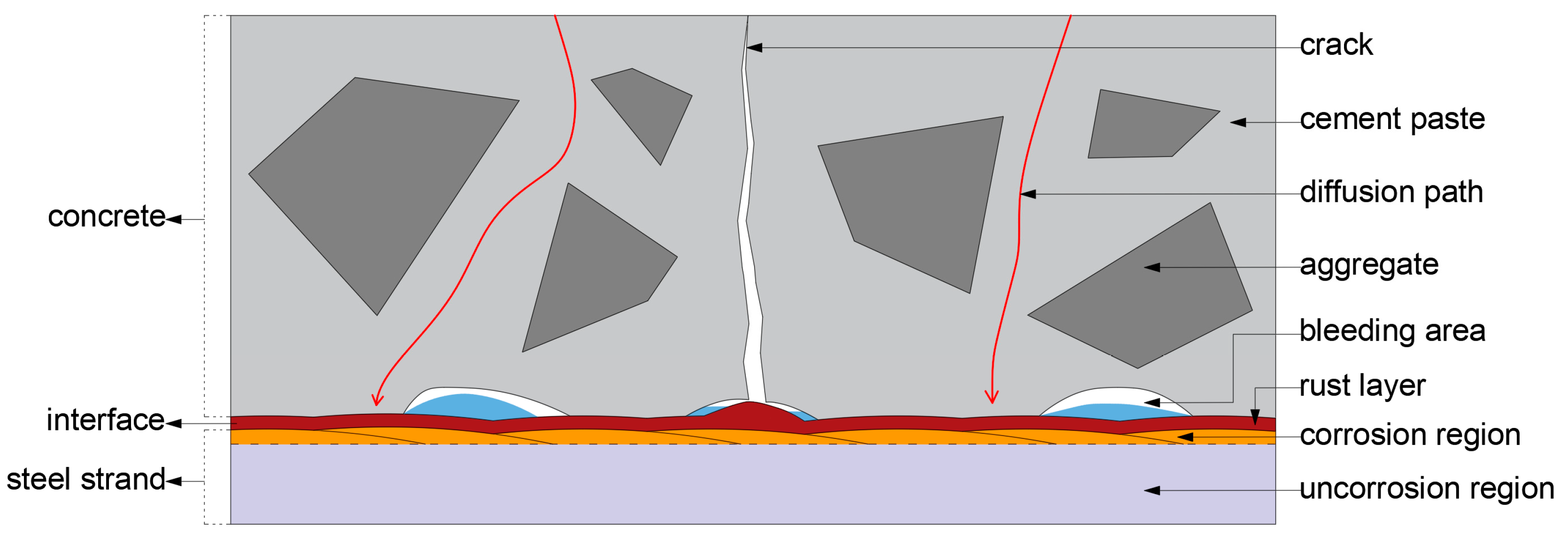Many studies have been conducted on the durability degradation of concrete, especially on the corrosion mechanism of steel bars, the chloride ion transport mechanism, and the degradation of material mechanical properties [3,4,5]. The corrosion models for steel bar cross-sectional loss can be mainly classified into uniform corrosion and non-uniform corrosion [6,7,8]. Zhou et al. [9] suggested that the corrosion of steel bars can be inferred from the depth of concrete carbonation, which can lead to uniform corrosion. Campione et al. [10,11] developed a corrosion model for prestressed steel wires based on the depth of corrosion pits. Jikal et al. [12] suggested that the corrosion of steel strands is a process of the continuous formation and coalescence of corrosion pits, and that surface corrosion can be regarded as uniform corrosion. Lee et al. [13] suggested that the mechanical properties of steel strands declined rapidly with the acceleration of chloride corrosion, the failure mode under tensile test was brittle failure. Li et al. [14,15] suggested that steel strands are more prone to non-uniform corrosion, and that the failure mode is likely fracture caused by stress corrosion in conventional environments. Ma et al. [16,17] proposed a prediction model of microstructure degradation in concrete and a new method to detect concrete cracking.