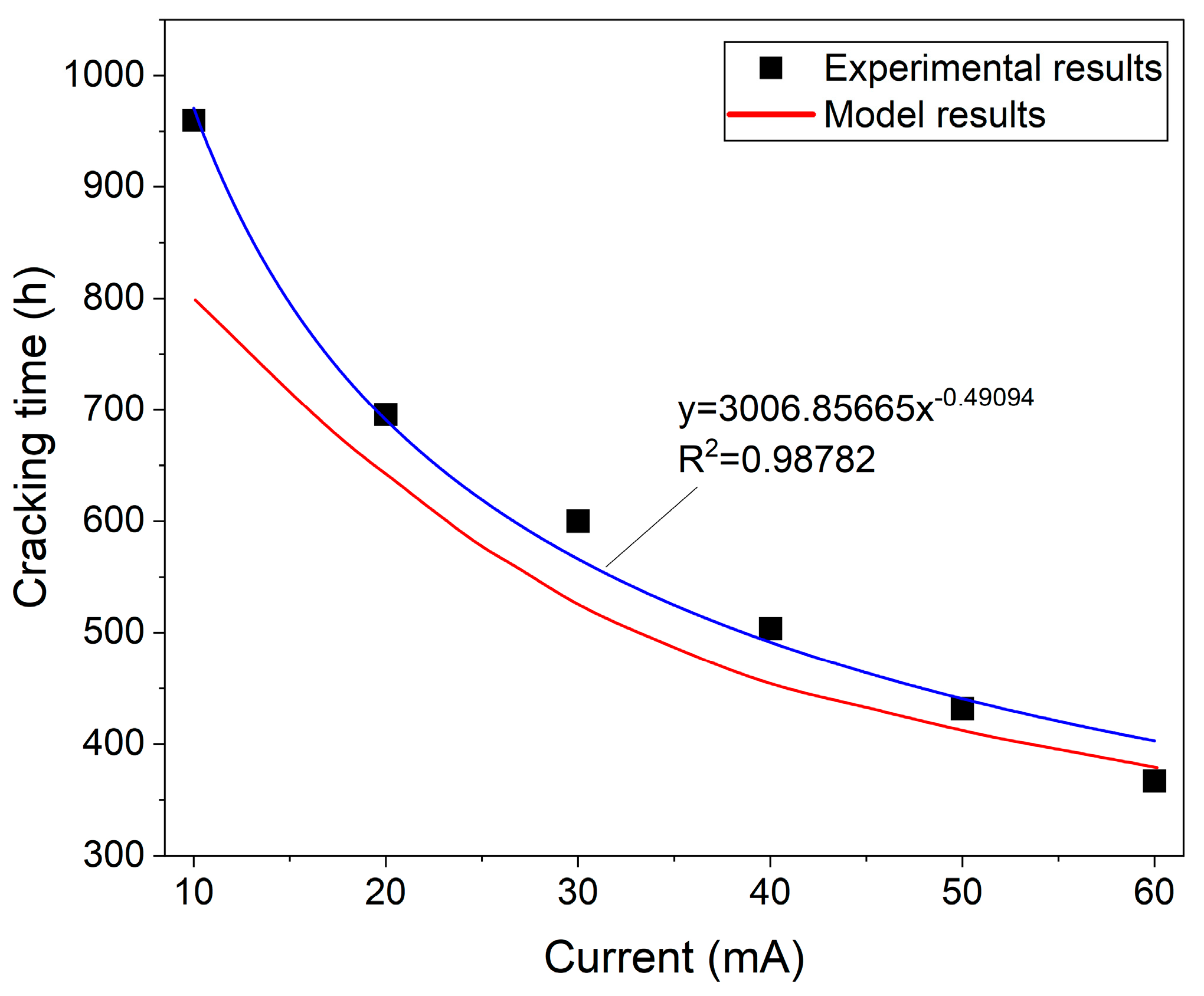 At present, research mainly focuses on the effects of factors such as chloride and carbonation on concrete structures, and there is little research on corrosion under stray currents. When stray currents and chlorides are present in the environment, their combined effect will exacerbate the corrosion of prestressed concrete, and the corrosion characteristics will also change accordingly. Therefore, this study aims to explore the corrosion characteristics of prestressed concrete under stray current through electrochemical corrosion tests. The mechanical properties of steel strands and the cracking mechanism of concrete after corrosion are analyzed. The prediction model for prestressed concrete cracking under stray current is established, taking into account the thickness of the concrete protective layer, concrete tensile strength, and stray current intensity.