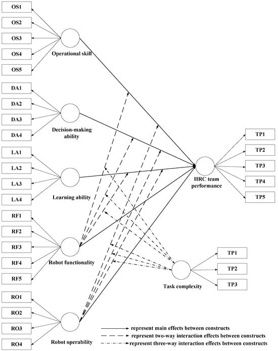 As tasks grow more complex, these relationships are increasingly moderated by task complexity []. Task complexity in construction refers to the degree a task is novel, difficult, or involves many interdependent steps and uncertainties []. Complex tasks typically demand greater human abilities []. Under high complexity, the value of a skilled human and a capable robot should be even more pronounced, since each can compensate for the challenges the other faces []. Prior studies indicate that as task complexity rises, performance increasingly depends on effective HRC and shared decision-making [,]. Therefore, this paper hypothesizes that task complexity positively moderates the interaction effects between human and robot factors on performance. Specifically: