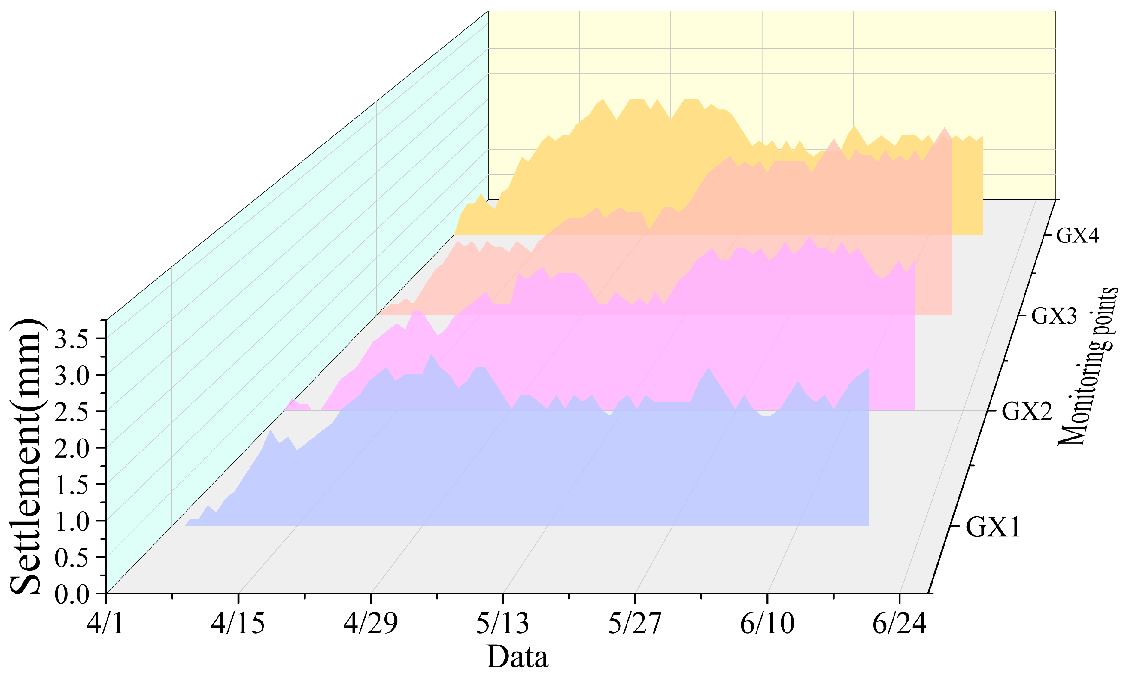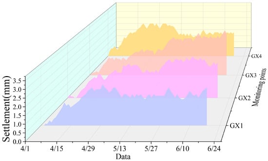Figure 5. According to the statistical analysis, the mean settlement values at the four monitoring points were 1.66 mm (GX1), 1.82 mm (GX2), 1.97 mm (GX3), and 1.94 mm (GX4). The standard deviations ranged from 0.60 to 0.87 mm, indicating that the settlement processes exhibited a certain degree of variability across different locations.