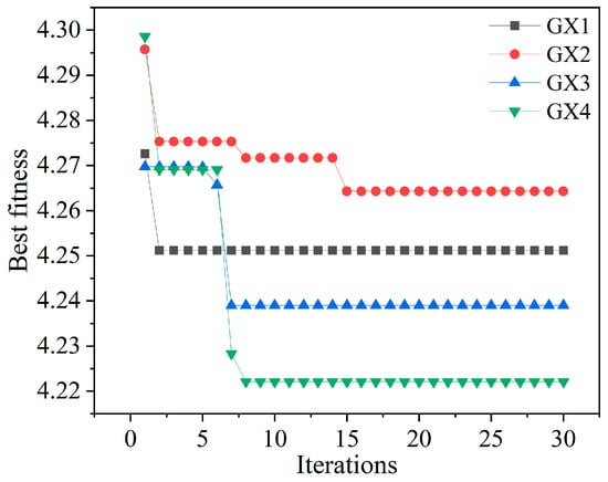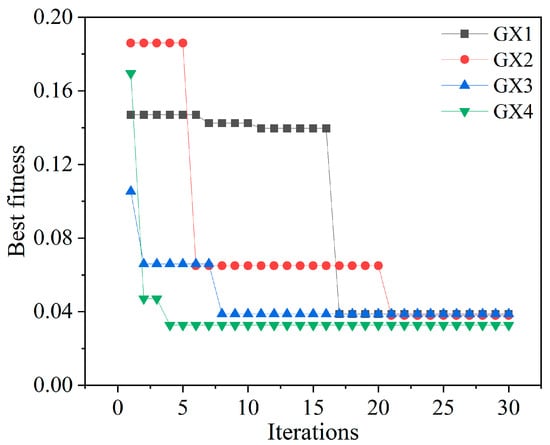 Figure 6 illustrates the minimum envelope entropy curve of the settlement data of adjacent buildings around the foundation pit after decomposition using the proposed GWO-VMD model. The average minimum envelope entropy of the four selected monitoring points (GX1–GX4) was calculated as 4.2468, indicating that the settlement data exhibit significant complexity and dynamic variability. This confirms that the application of GWO-VMD can effectively enhance feature extraction accuracy and decomposition performance.