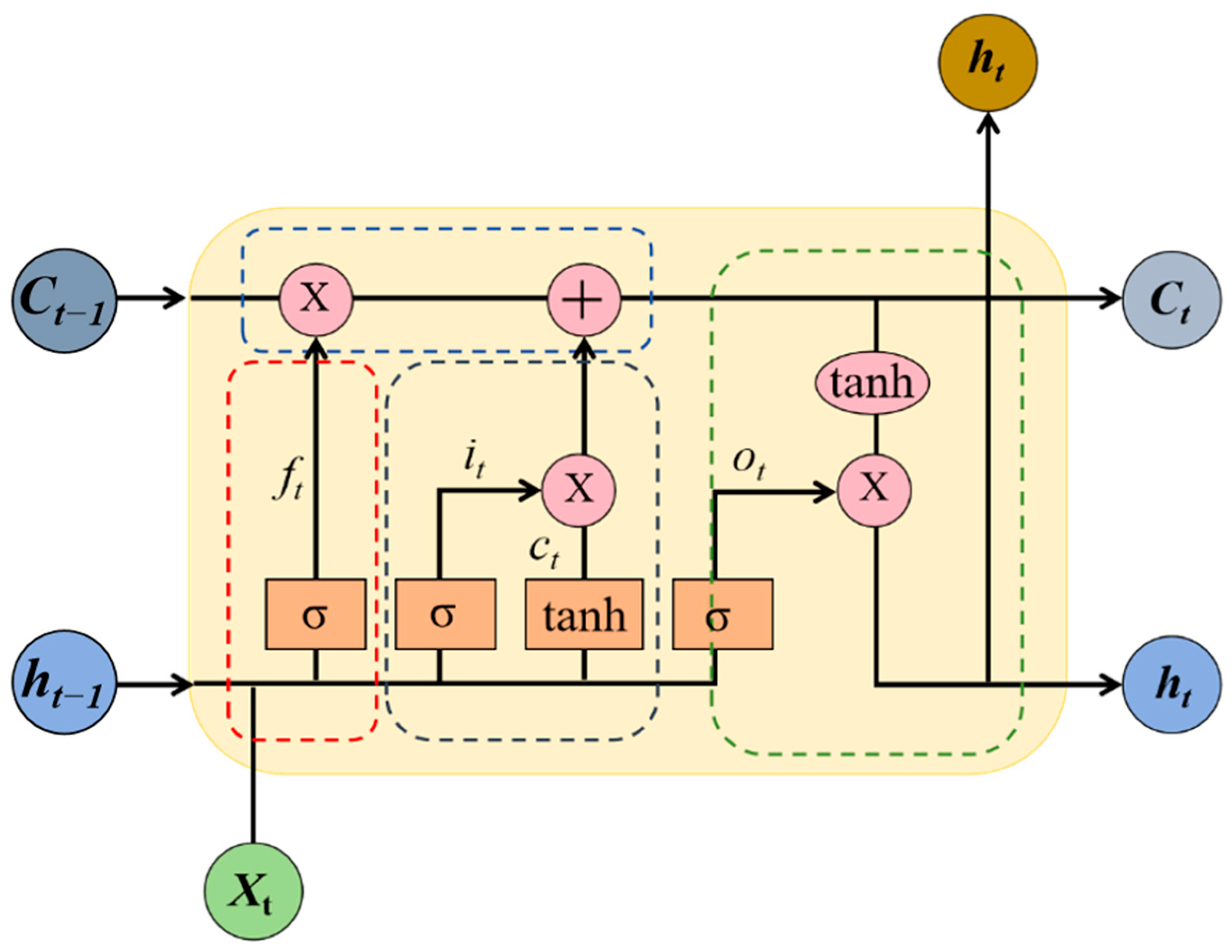30]. By introducing memory cells and gating mechanisms, LSTM is able to capture both short-term dynamics and long-term dependencies in sequential data, making it particularly suitable for time-series forecasting and sequence modeling. The core structure of LSTM is defined by a set of gating functions that regulate the information flow: the forget gate, the input gate, the candidate state, and the output gate. The computation process of an LSTM cell can be expressed as follows: