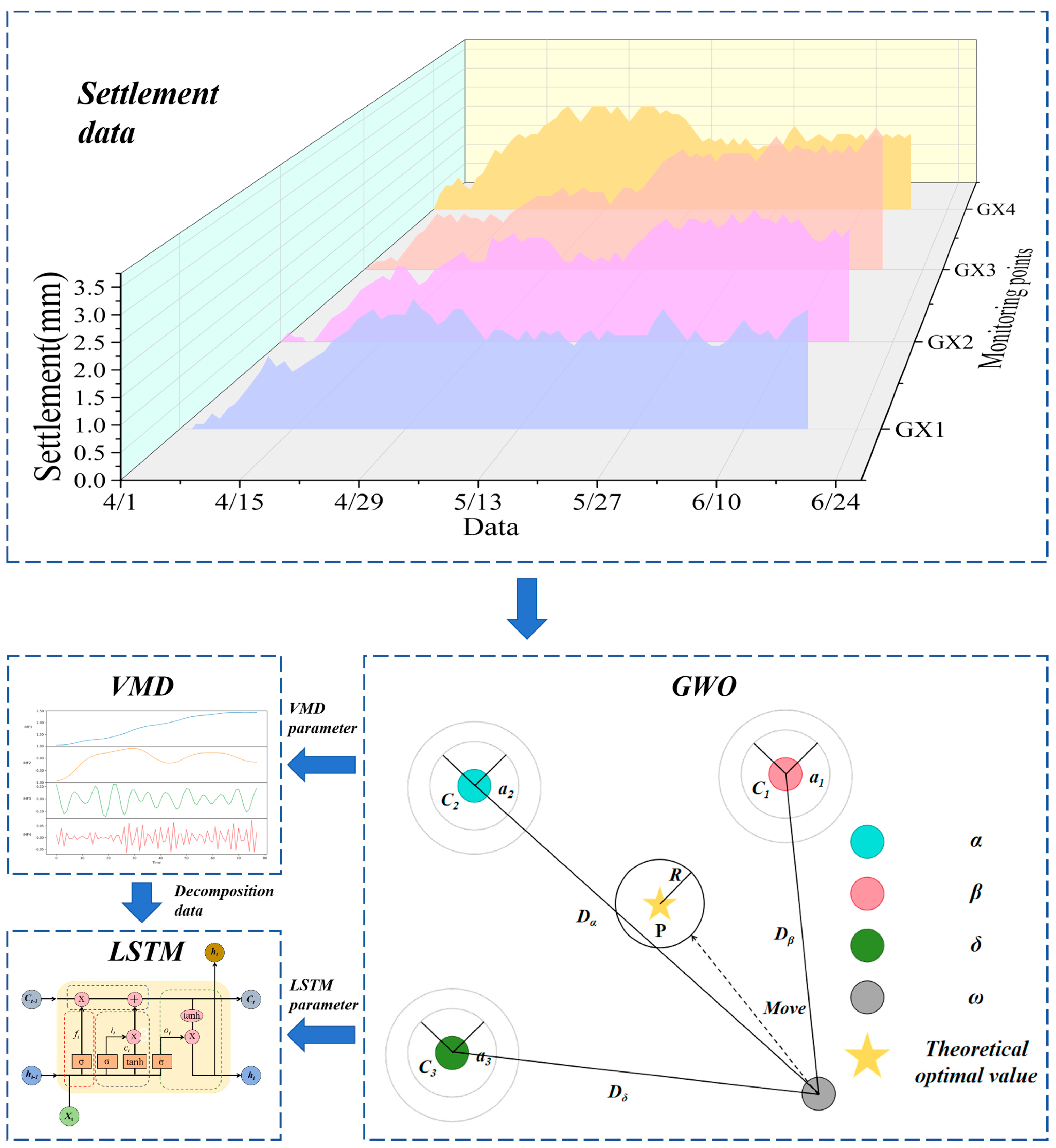 This section introduces the proposed GWO-VMD-LSTM settlement prediction model, with its structural framework illustrated in