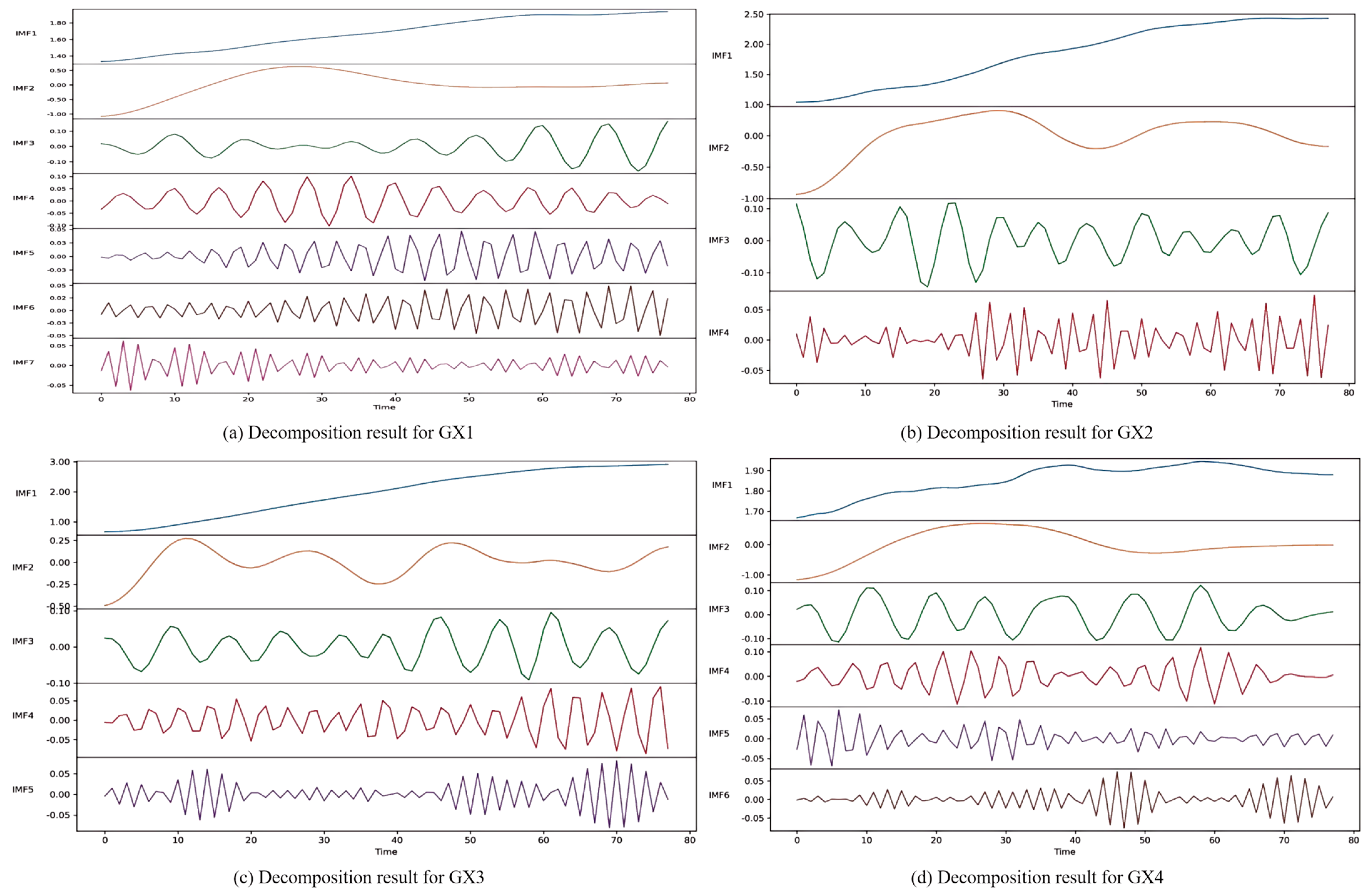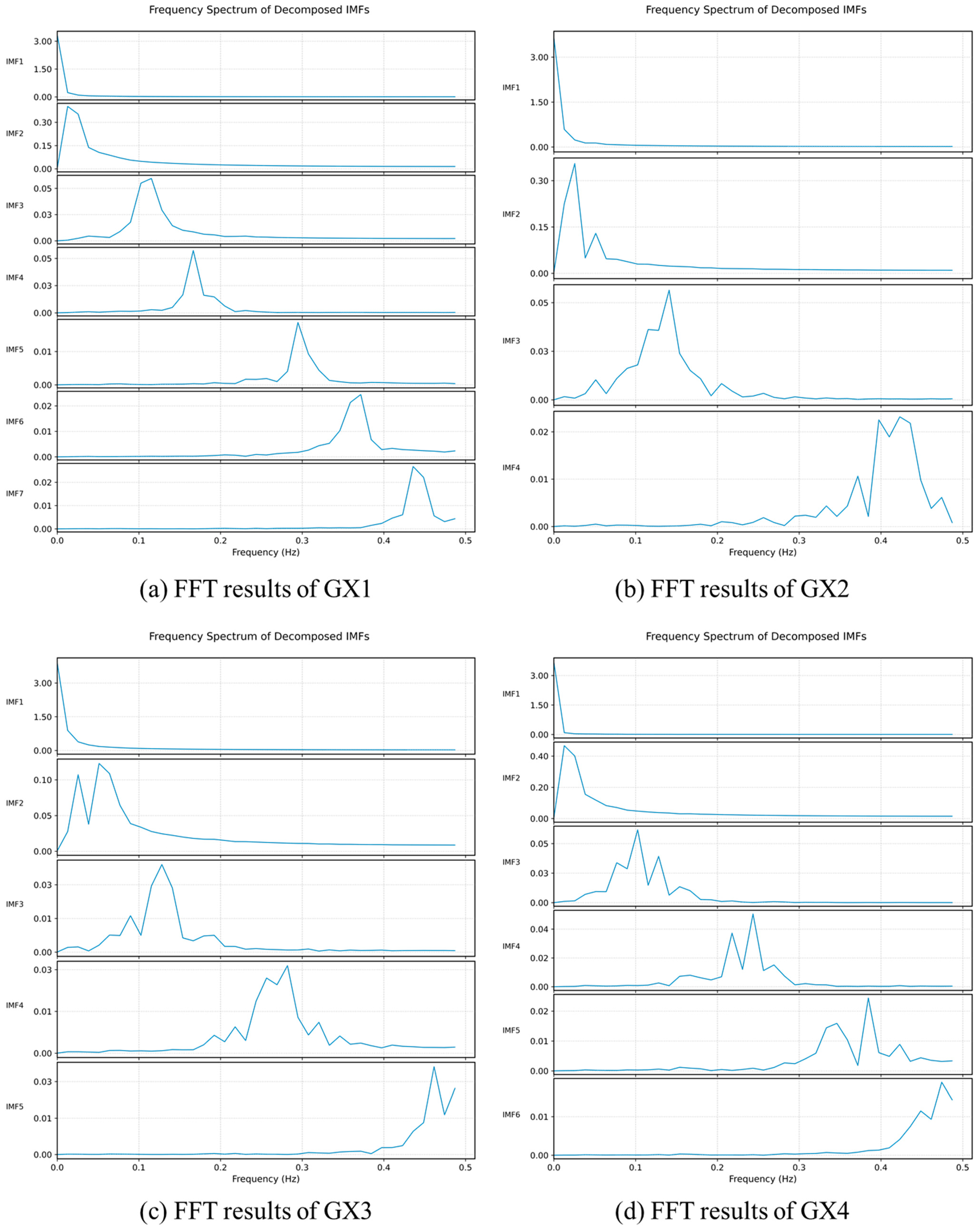 Figure 7 illustrates the settlement data after VMD. To further validate the decomposition results, the fast Fourier transform was applied to the settlement data from the four monitoring points, and the central frequencies of the IMFs obtained by GWO-VMD were calculated.