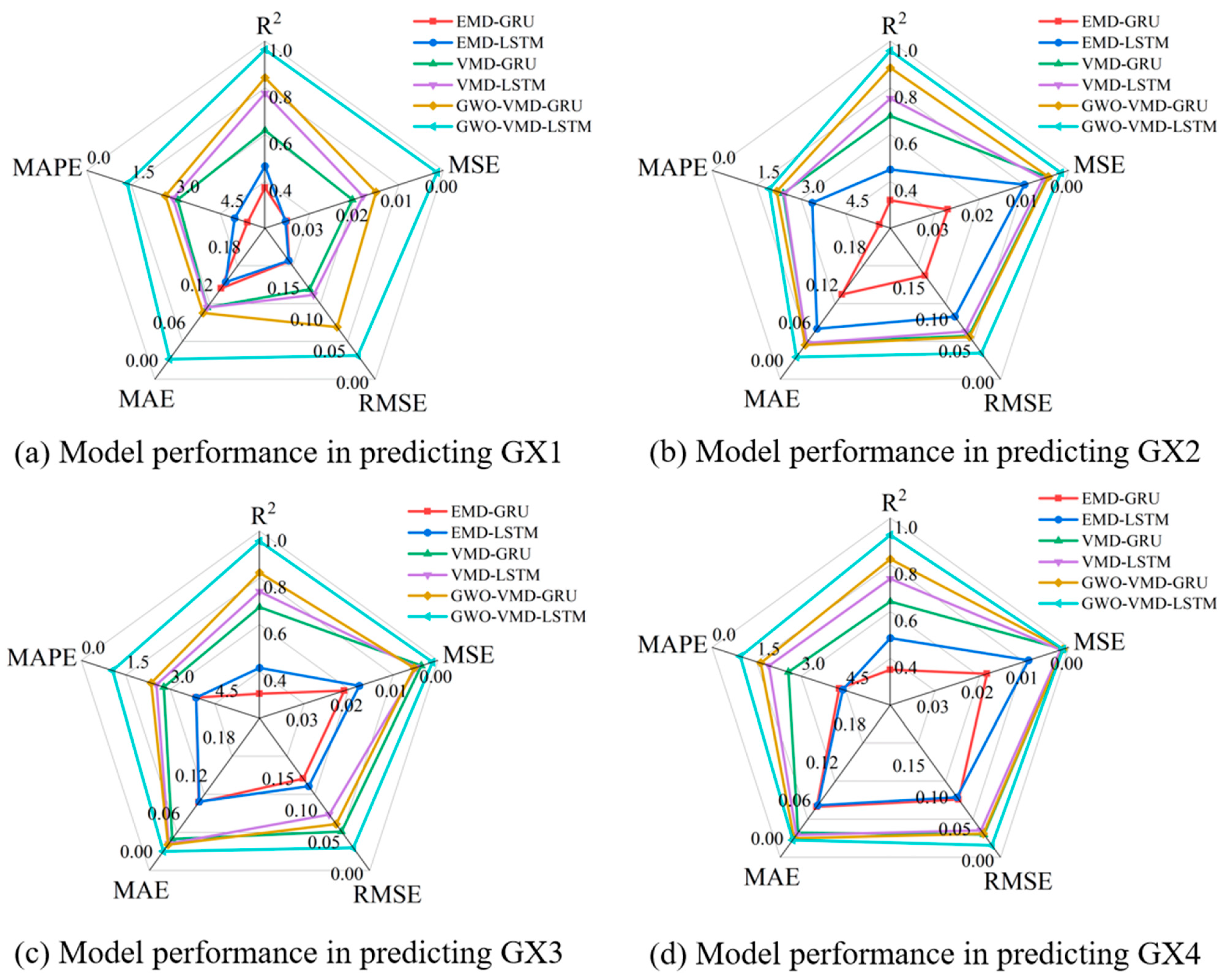 The comparative results across the four monitoring points (GX1–GX4) reveal clear spatial variability in model performance. At GX1, the prediction accuracy of most models was relatively unsatisfactory. For instance, the baseline EMD-LSTM achieved an R2 of only 0.465, with a high RMSE of 0.1883, but the proposed GWO-VMD-LSTM improved R2 to 0.964, with a relatively lower RMSE of 0.0379 compared to other models. This indicates that the inherent noise and irregular patterns in GX1 data may have constrained the models’ fitting capacity. In contrast, both GX2 and GX3 demonstrated more stable predictive performance, where the proposed GWO-VMD-LSTM consistently achieved the best trade-off between accuracy and error. Specifically, at GX2, the model yielded an R2 of 0.959, RMSE of 0.0418, MAE of 0.0354, and MAPE of only 1.933%; at GX3, the R2 remained high at 0.957, with RMSE and MAE of 0.0359 and 0.0303, respectively. These results confirm the robustness of the hybrid decomposition–optimization framework under moderately complex settlement signals.