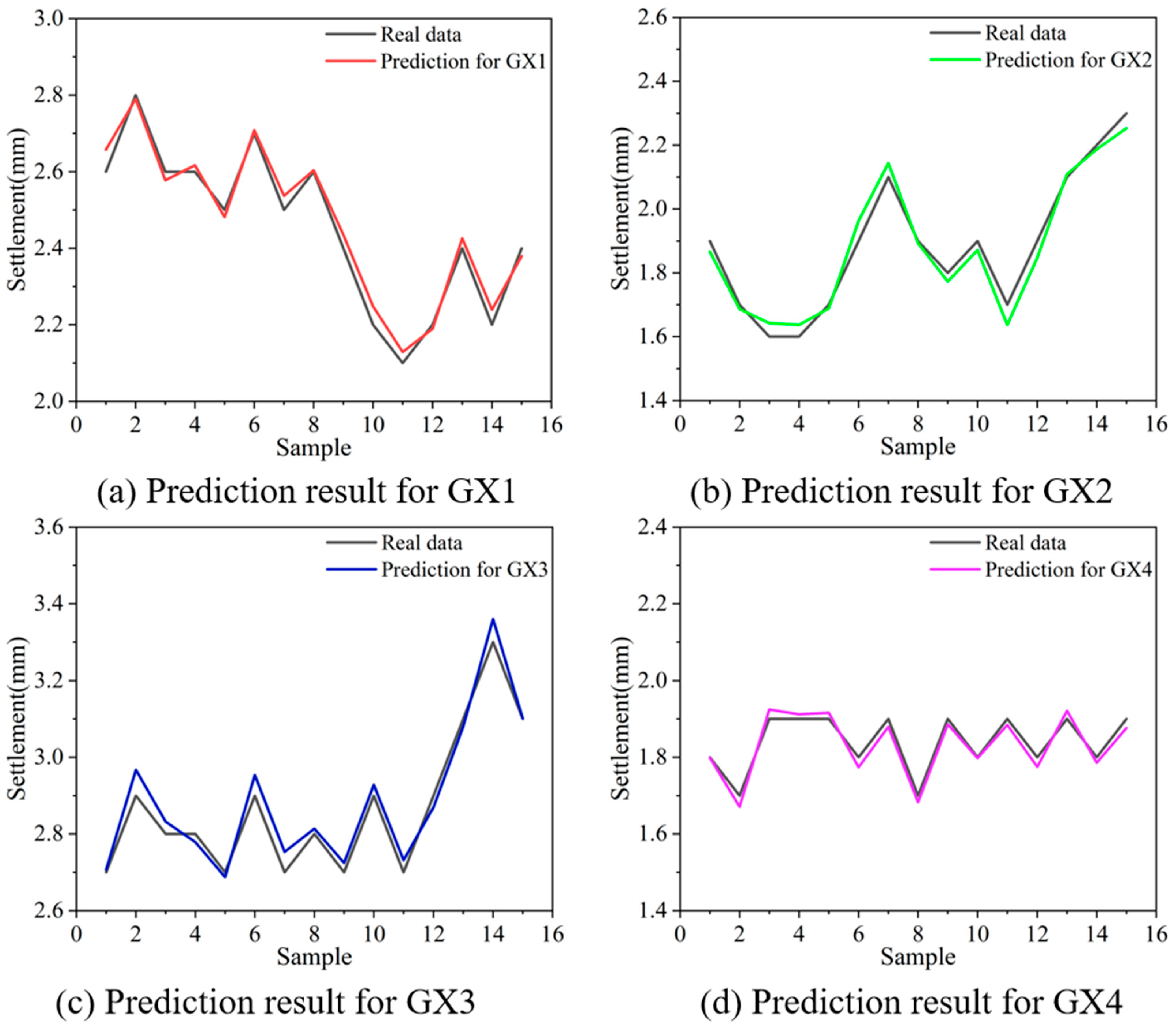 The predictive error was the smallest at GX4, where the proposed model achieved an R2 of 0.928, RMSE of 0.0191, and MAPE of only 0.953%, representing the lowest error values among all four sites. It is noteworthy that despite a slight decrease in R2 compared with GX2 and GX3, the dramatic reduction in error indices suggests that the model captures the settlement dynamics at GX4 with greater precision.