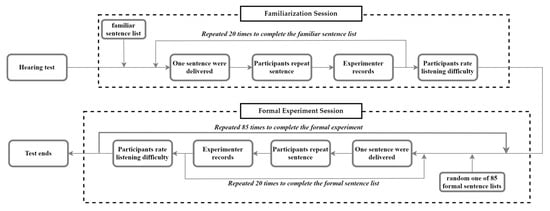 Before the formal experiment, participants completed a hearing test and a familiarization session. During the formal experiment, 20 sentences (one sentence list) were presented under each condition. For each sentence, participants repeated the words they heard, and the experimenter recorded their responses. Speech intelligibility scores for each condition were derived from the proportion of correctly reproduced words. Upon completion of each condition, participants rated the listening difficulty on a 0–3 scale. The overall process is shown in Figure 5.