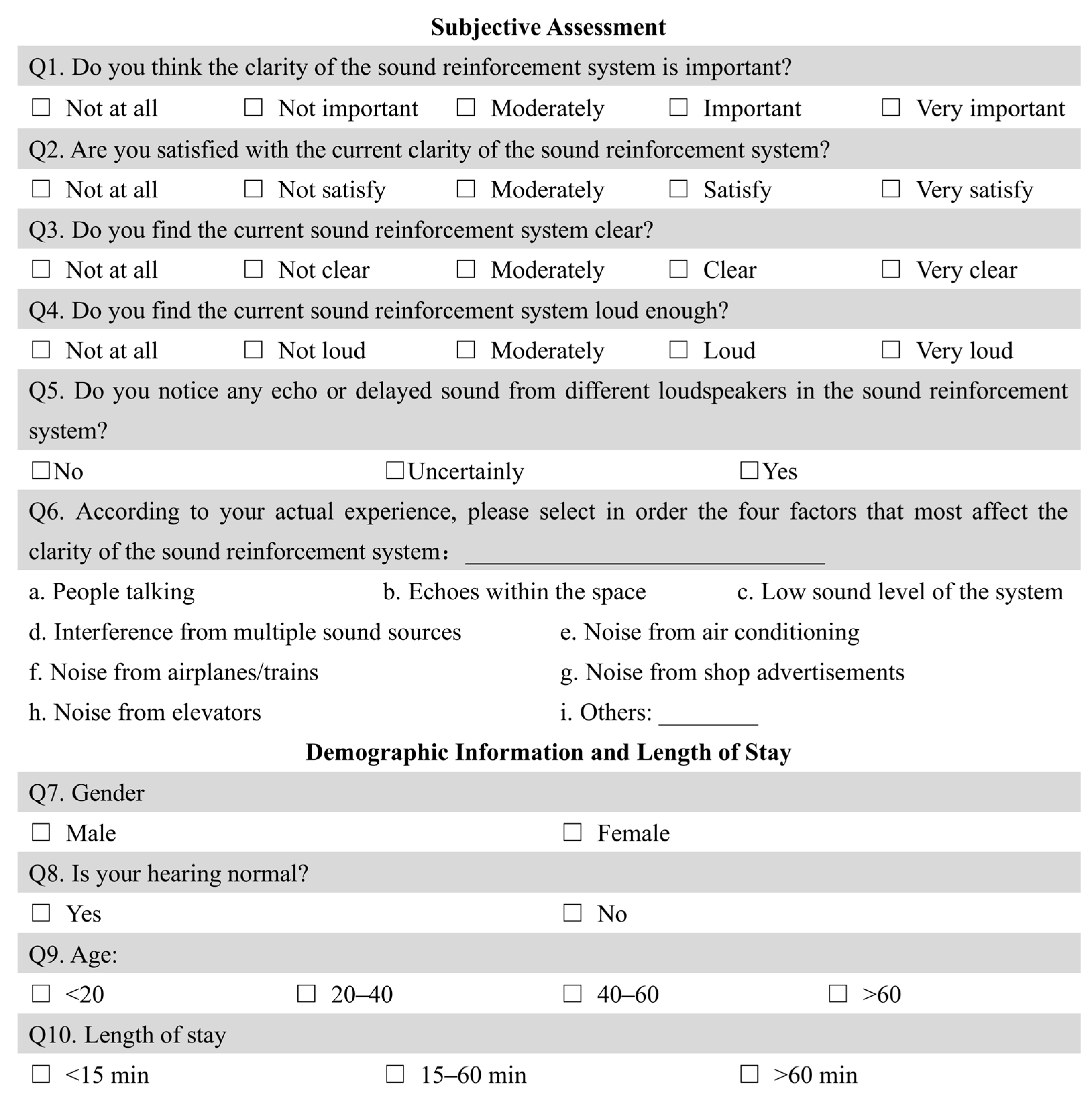 - GB/T 12060.16-2017; Sound System Equipment. Part 16: Objective Rating of Speech Intelligibility by Speech Transmission Index. Standards Press of China: Beijing, China, 2018.