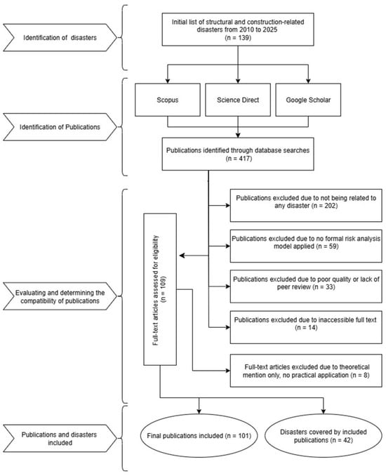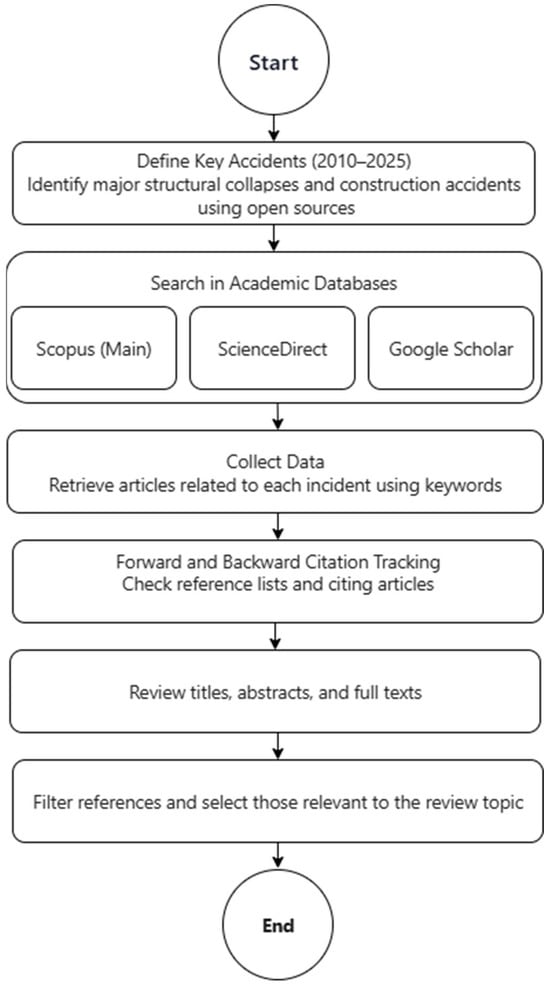 Following the identification of 139 structural failures and construction-related disasters that occurred between 2010 and 2025 through open-source information, a comprehensive literature search was conducted using the three academic databases specified in Section 2.2, Scopus, ScienceDirect, and Google Scholar. The search strategy, illustrated in Figure 2, guided the retrieval of peer-reviewed publications related to these incidents. Forward and backward citation tracking was also applied to ensure the inclusion of all relevant studies.
