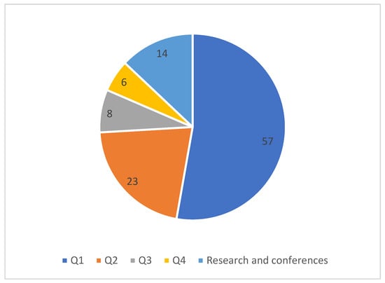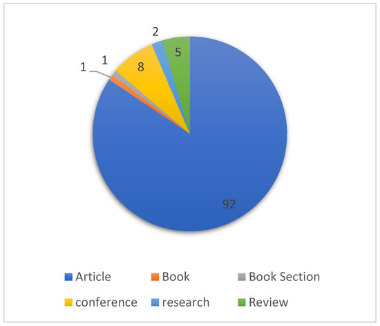 After applying these criteria, a total of 109 publications were selected for in-depth analysis. These included 92 journal articles, 8 conference papers, 5 reviews, 2 research reports, 1 book, and 1 book chapter (see Figure 3). The majority of the selected publications were peer-reviewed journal articles, reflecting the dominance of academic research in this field. Conference proceedings and reviews contributed additional insights into emerging trends and synthesis of existing knowledge.