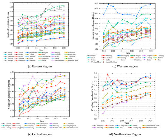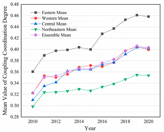 To reflect the changing trend of the coupling coordination degrees of different cities, this study used the mean coupling coordination degree data of the eastern, central, western and northeastern regions, as well as the overall mean, from 2010 to 2020. The horizontal measurement results of the coupling coordination degree of the four regions and the overall mean are shown in Figure 2.