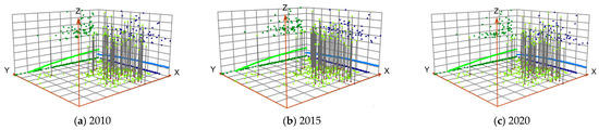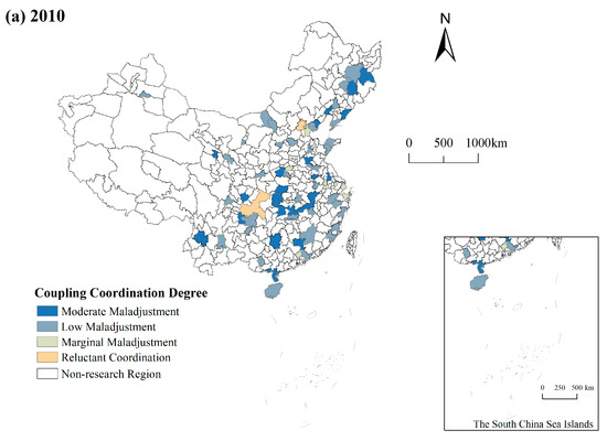 The coupling coordination results are shown in Table A3 in Appendix A. The coupling coordination degree development trend is basically consistent with the comprehensive development level of cities. The average coupling coordination degree of 70 large- and medium-sized cities in China showed a steady rising trend from 2010 to 2020, but it dropped slightly in 2015 and 2020. This shows that, after 10 years of development, the change trend of the coupling coordination degree flattened out, and the coupling coordination degree will be stable in the next few years. Regarding the specific city data, Chongqing’s coupling coordination level ranked first in China from 2010 to 2012 because Chongqing’s affordable housing market had a high development level in early 2010, which had a certain promotion effect on urban development. In 2012, it began to decline, and since 2017, it has shown a rebound trend, but it has always maintained a top five position in China. Shanghai and Beijing have maintained a steady upward trend. The coupling coordination degree of Shenzhen showed a trend of nearly exponential growth in general and began to rank first in China in 2012. In addition, during 2010 to 2020, there was a phenomenon where the difference in coupling coordination degree gradually increased between domestic cities, and the difference between the highest and lowest coupling coordination degree increased from 0.269 in 2010 to 0.350 in 2020. This shows that the gap between the urban development level and the coupling and coordination degree of the affordable housing market between different cities also increased. Cities with higher coupling and coordination degrees can better reflect the mutual promotion between the affordable housing market and urban development, which can better guarantee people’s livelihoods in the process of urban development and meet people’s yearning for a better life.