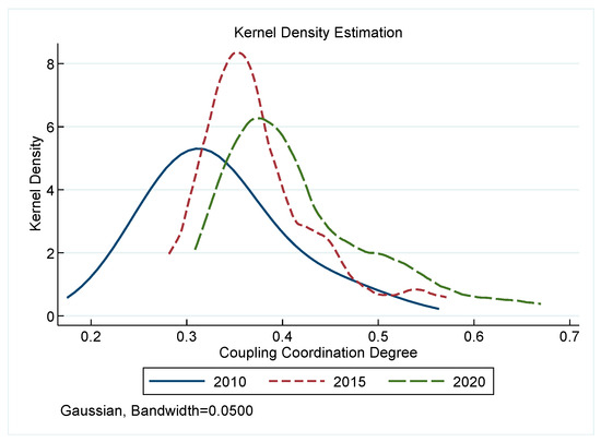 where h is the window width, N is the observation number, and is the kernel function. In this study, the Gaussian kernel was selected to estimate the dynamic evolution of the coupling coordination degree level in 70 Chinese cities.