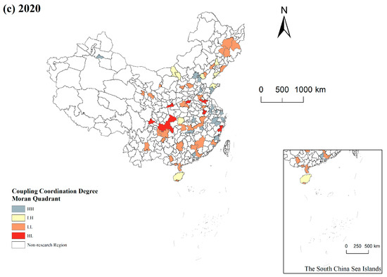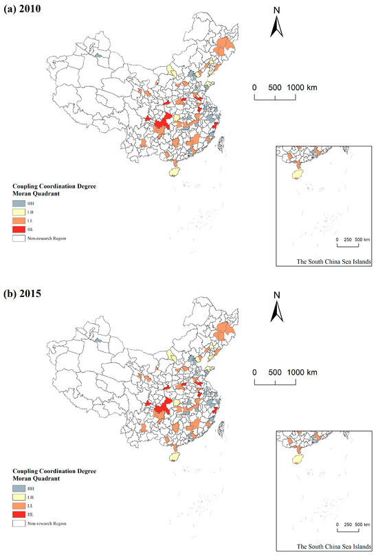Table 3 lists the specific distinctions and implications of the four quadrants of the local Moran index. In the quadrant code, H represents the high-value region, L represents the low-value region, the first letter represents the set region i, and the second letter represents other adjacent regions.