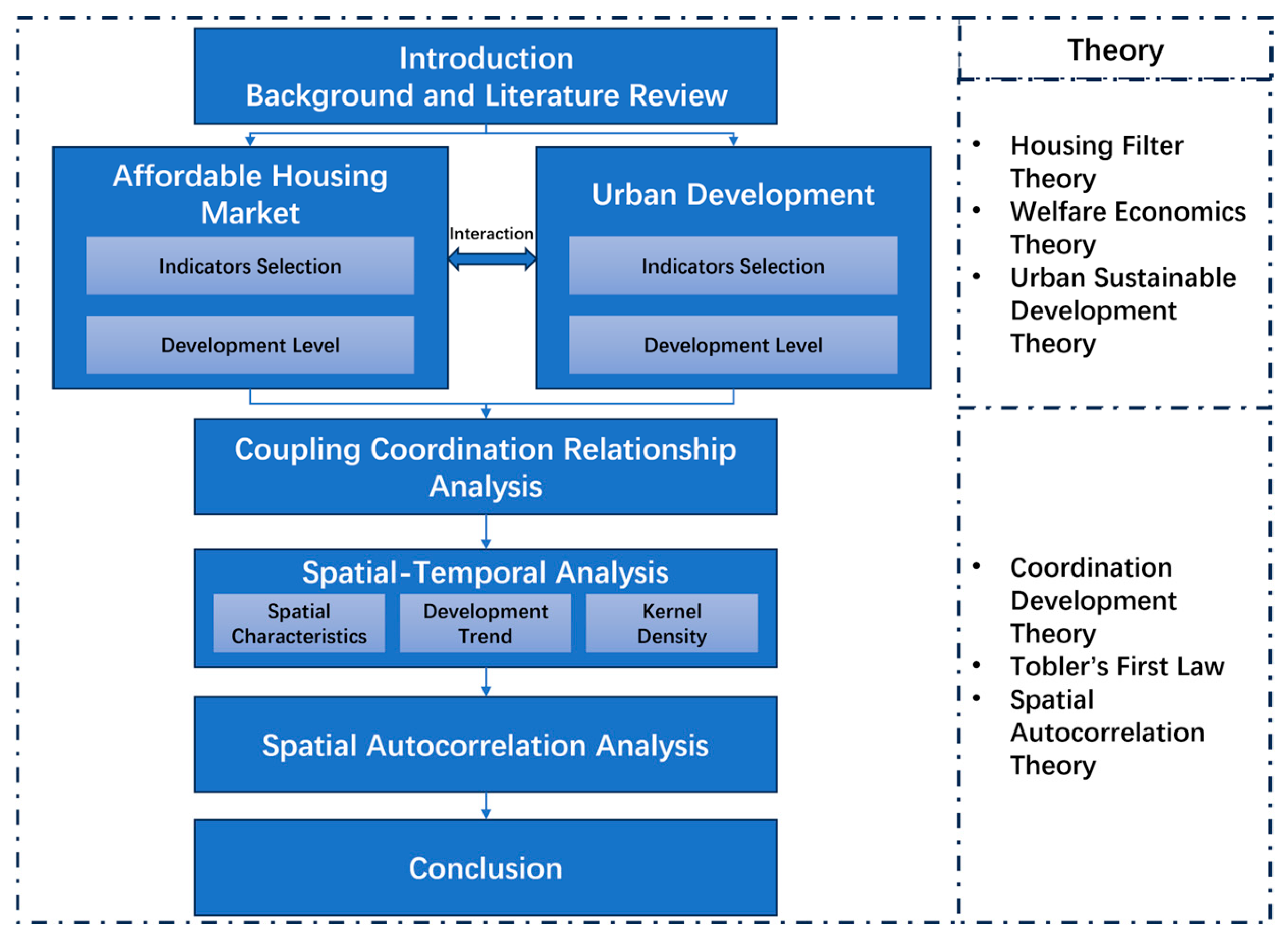 In this section, the research framework, the evaluation method of affordable housing market and urban development, coupling coordination degree model, and the research scope and data sources selected in this study are introduced.