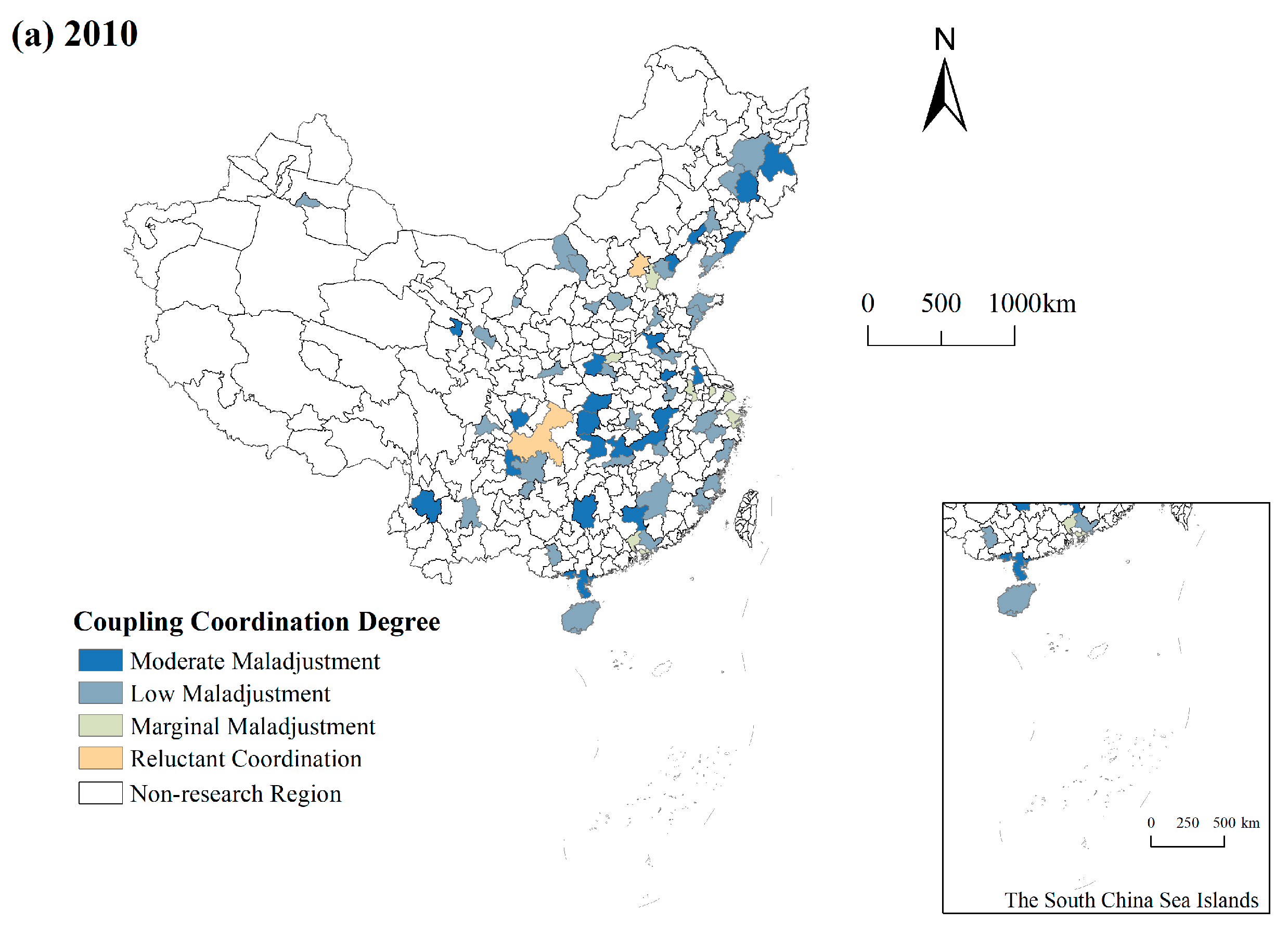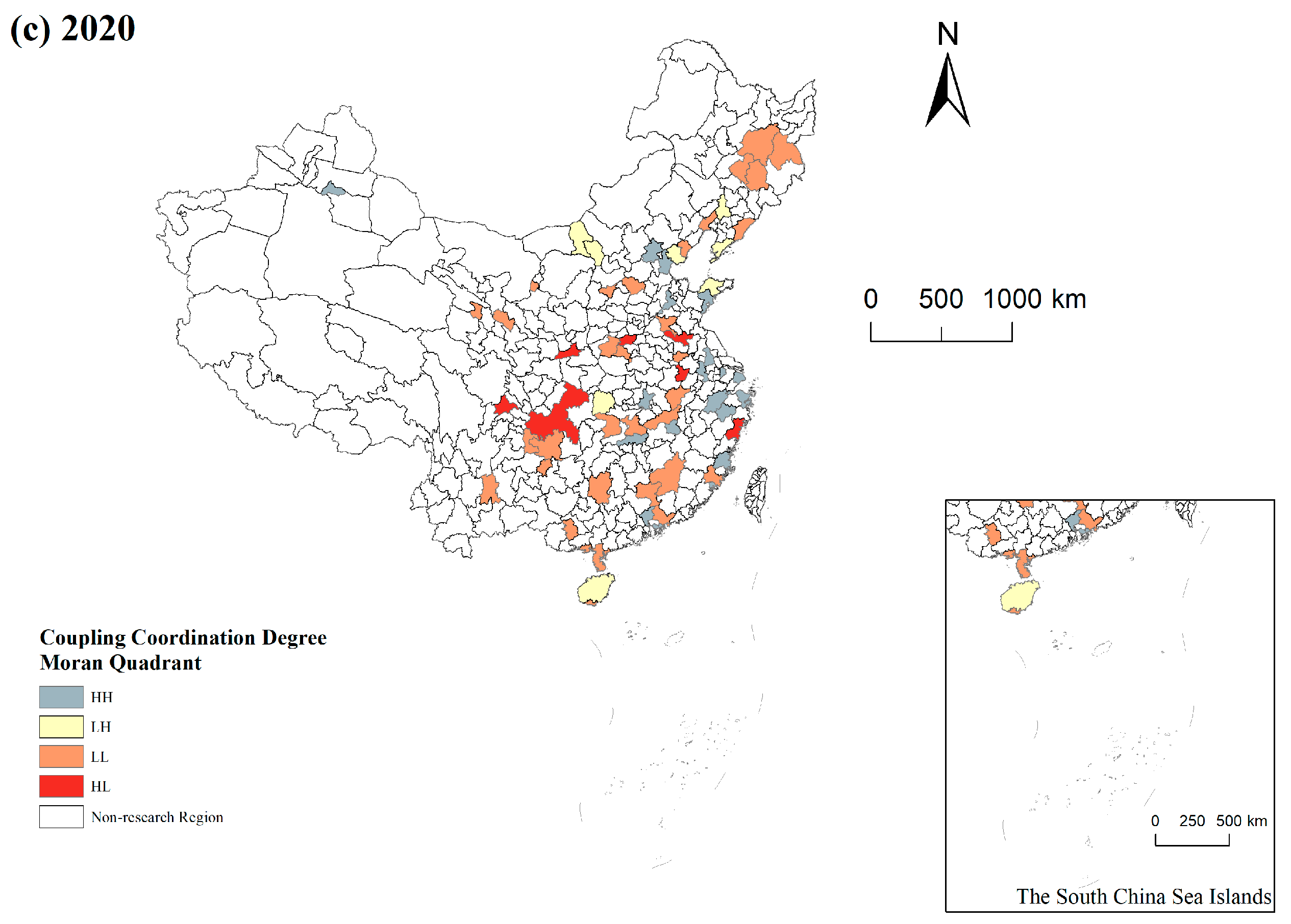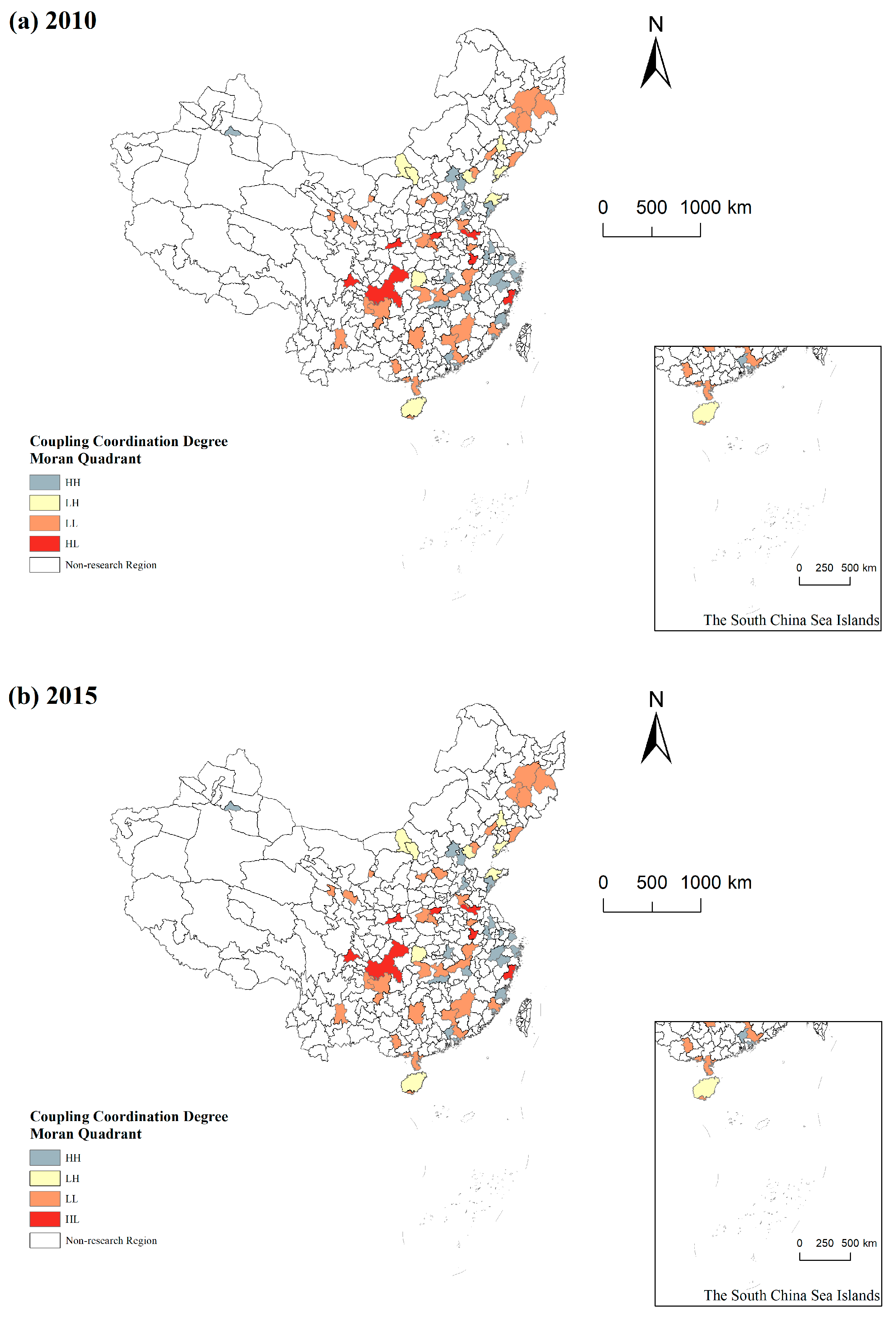 Table 9. Distribution of Moran scatter quadrants of coupling coordination degrees in 2010, 2015 and 2020.