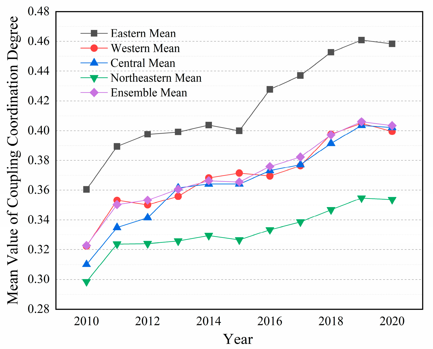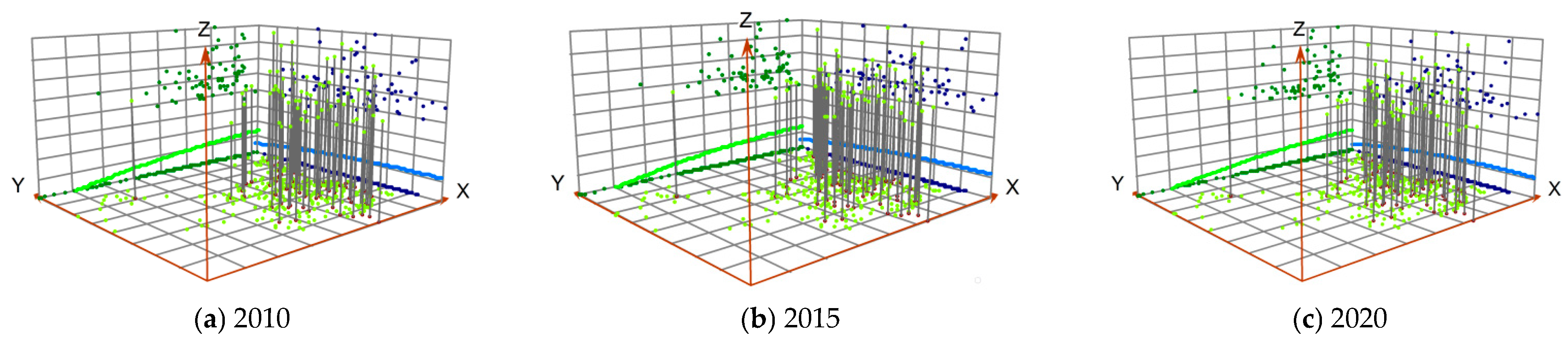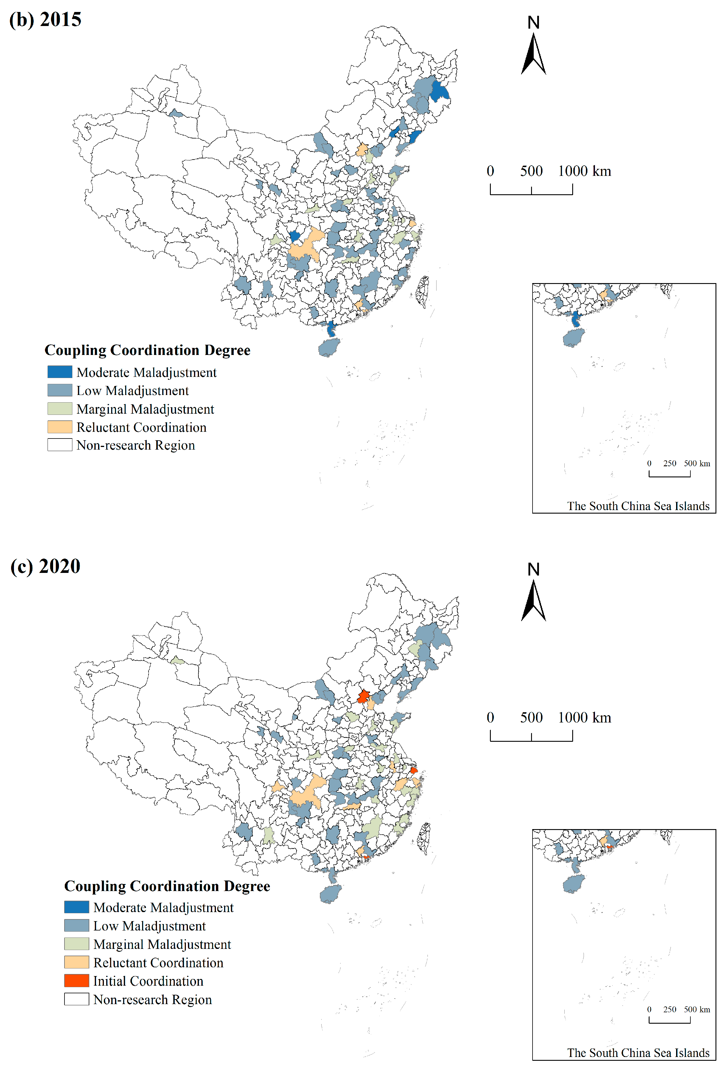 Table 9. Distribution of Moran scatter quadrants of coupling coordination degrees in 2010, 2015 and 2020.