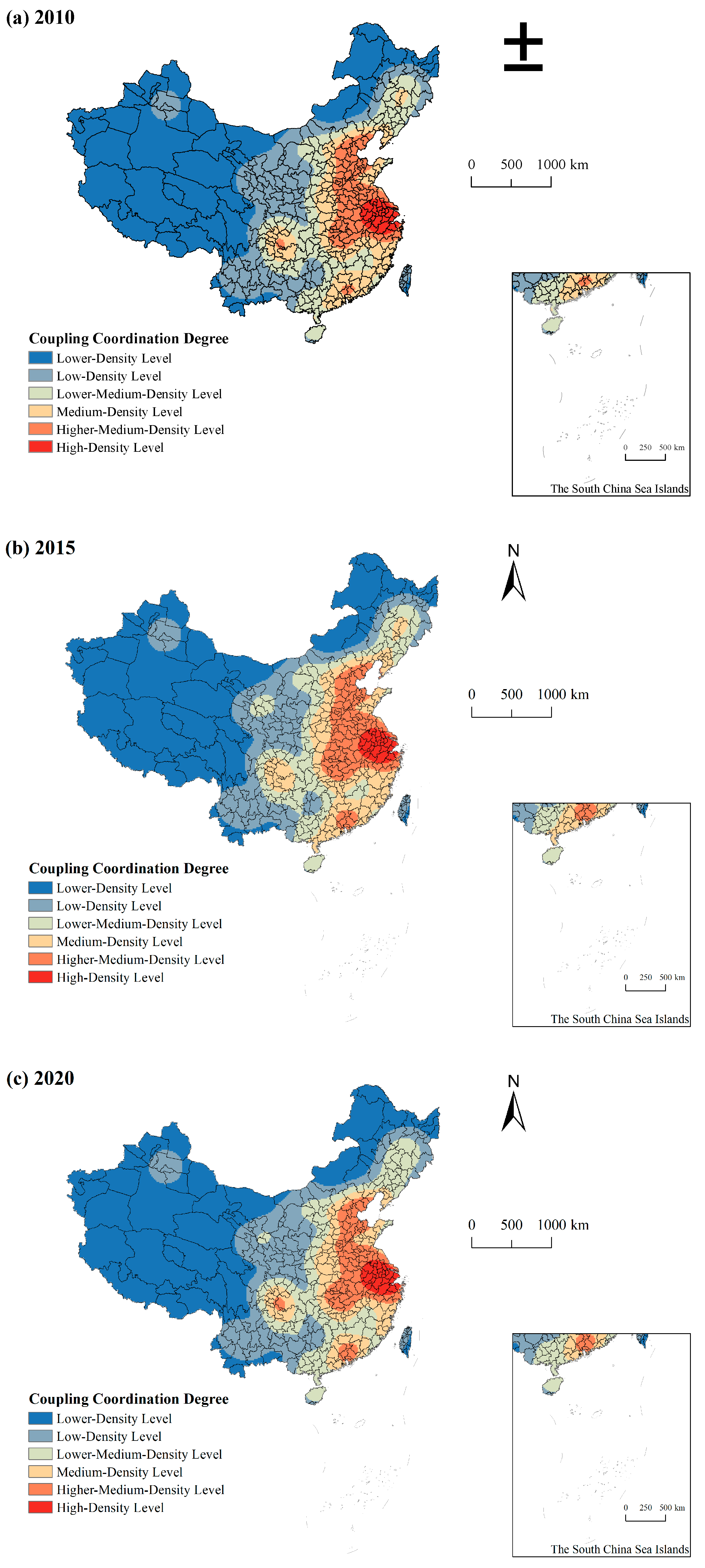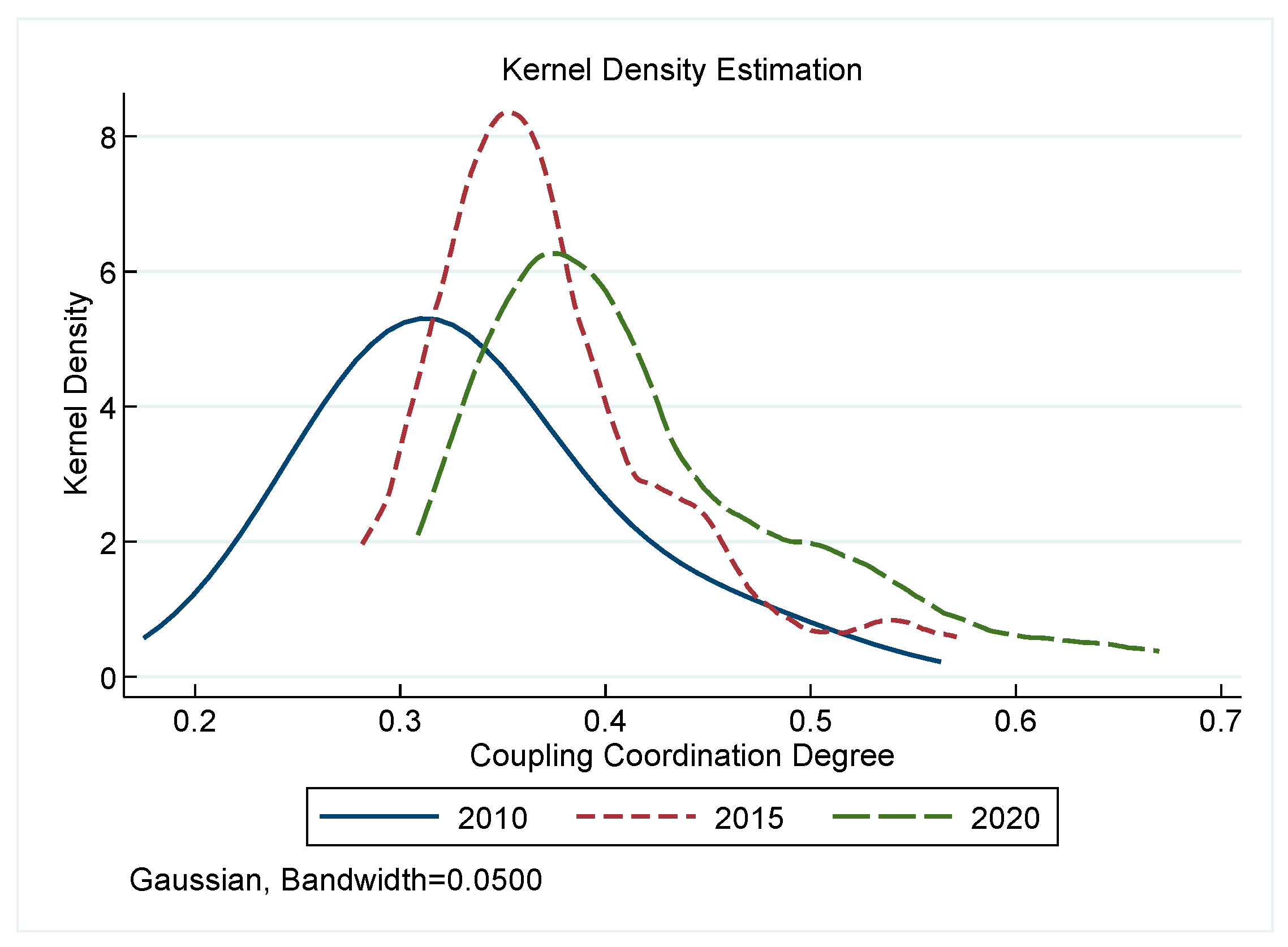 where h is the window width, N is the observation number, and K · is the kernel function. In this study, the Gaussian kernel was selected to estimate the dynamic evolution of the coupling coordination degree level in 70 Chinese cities.