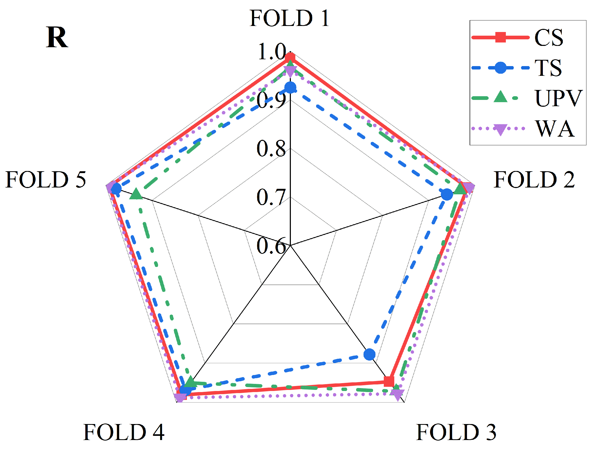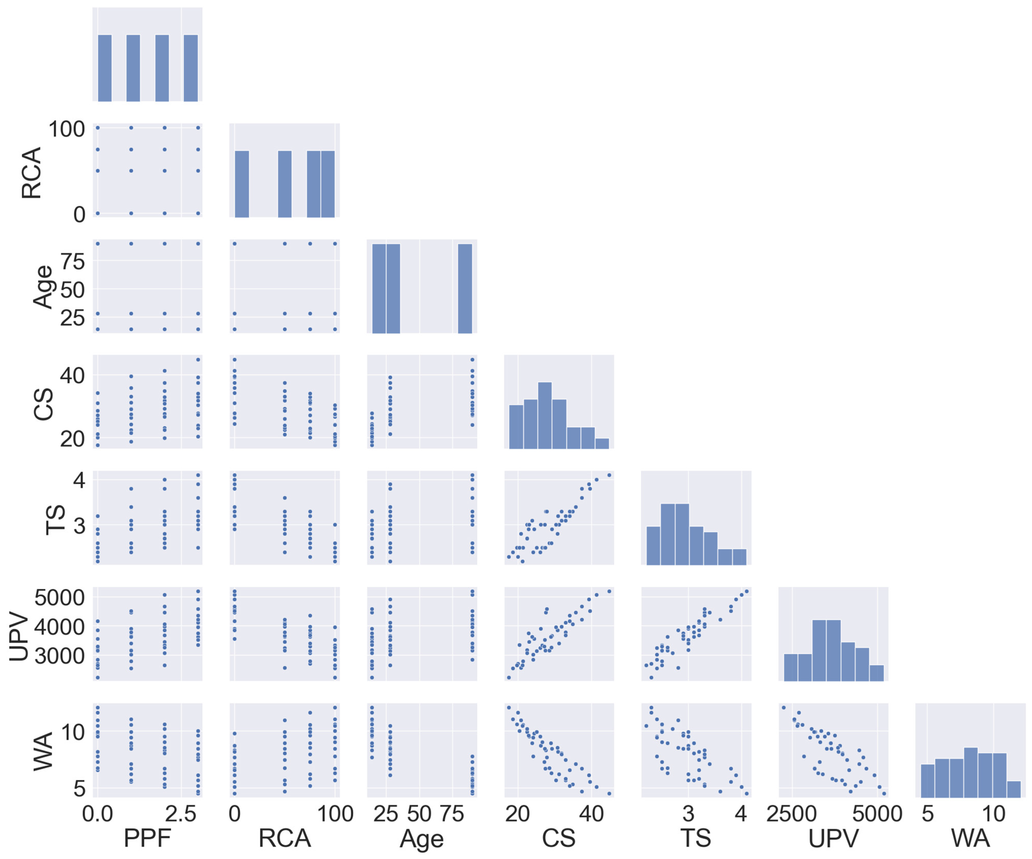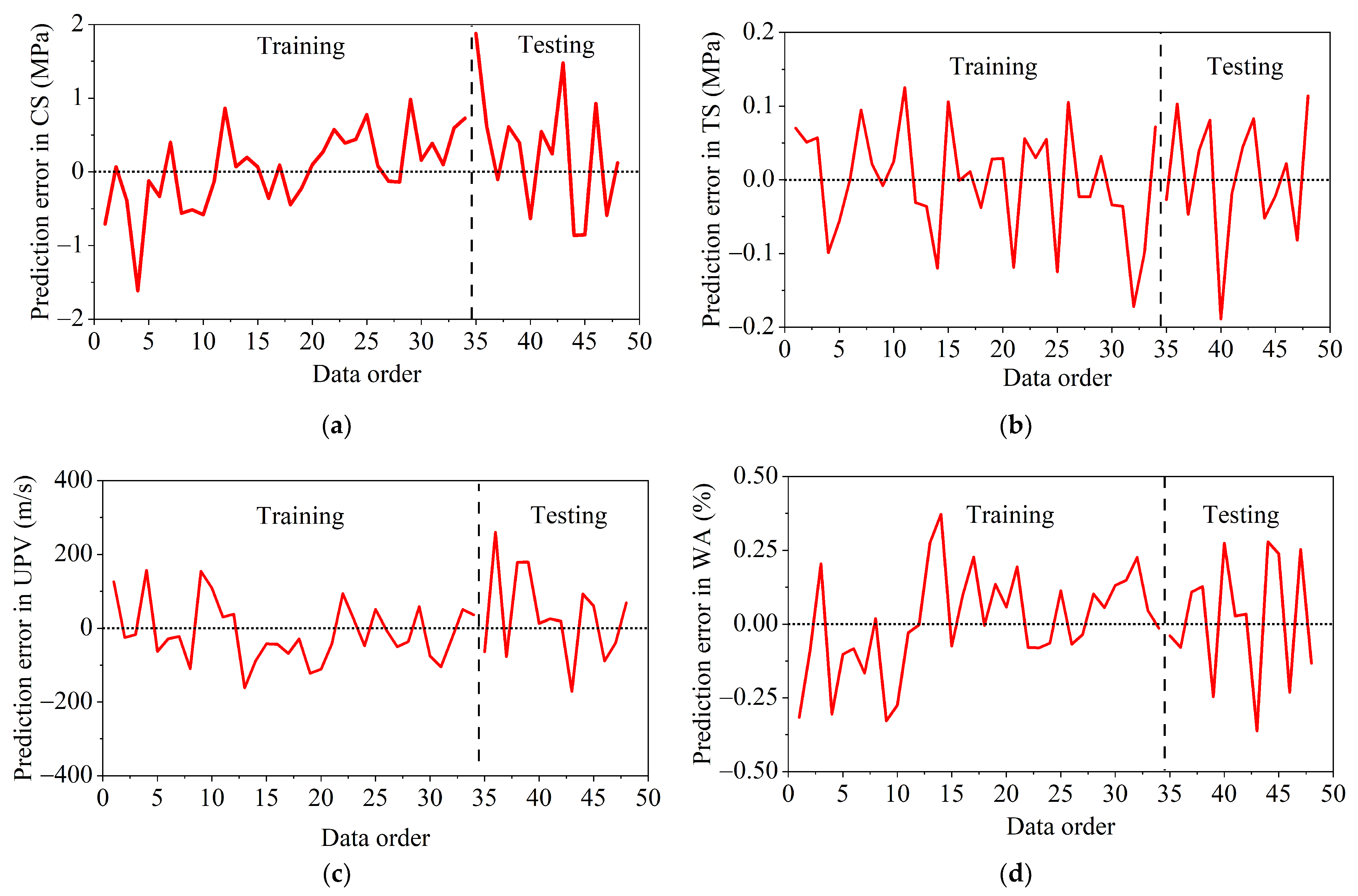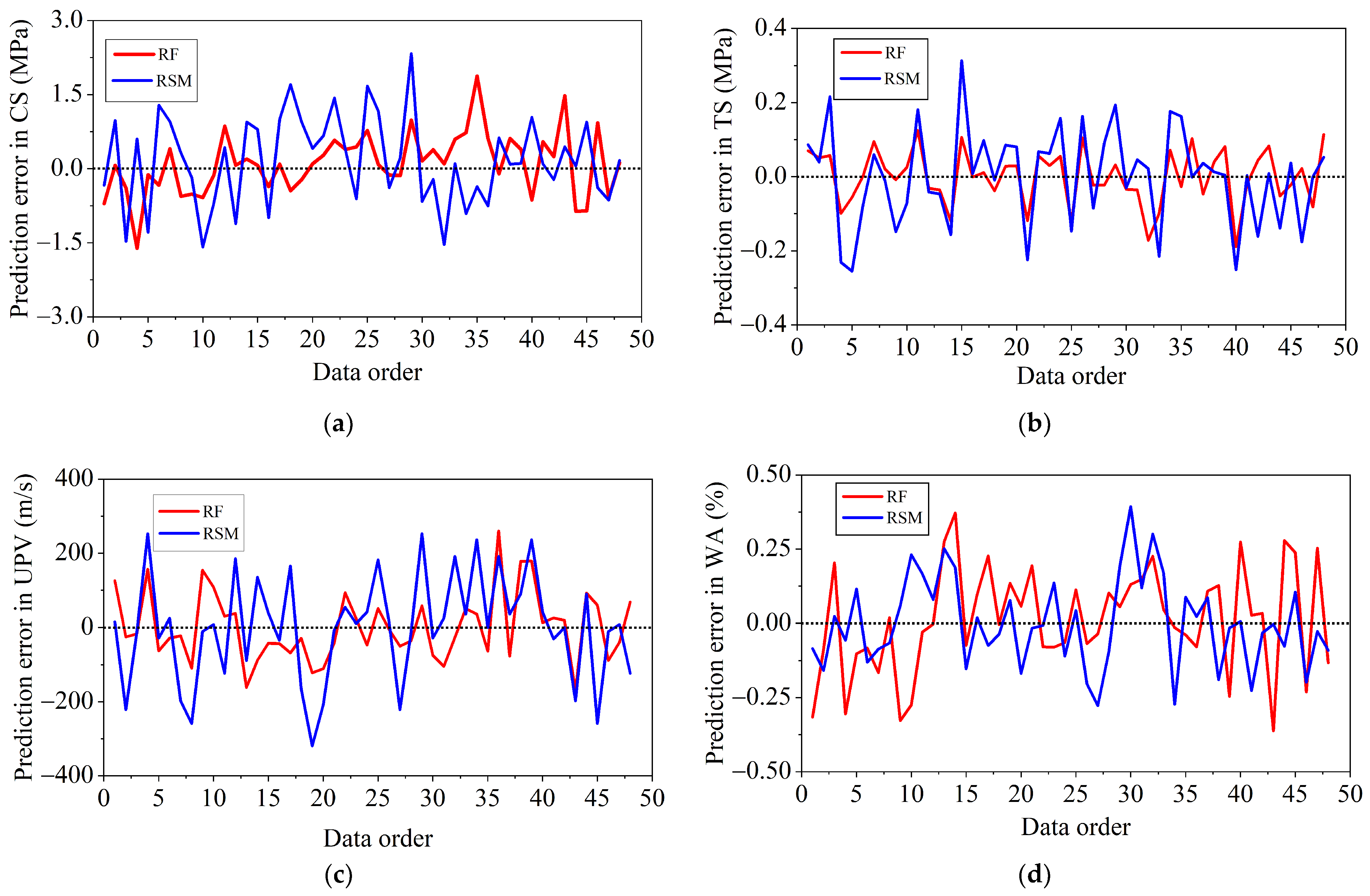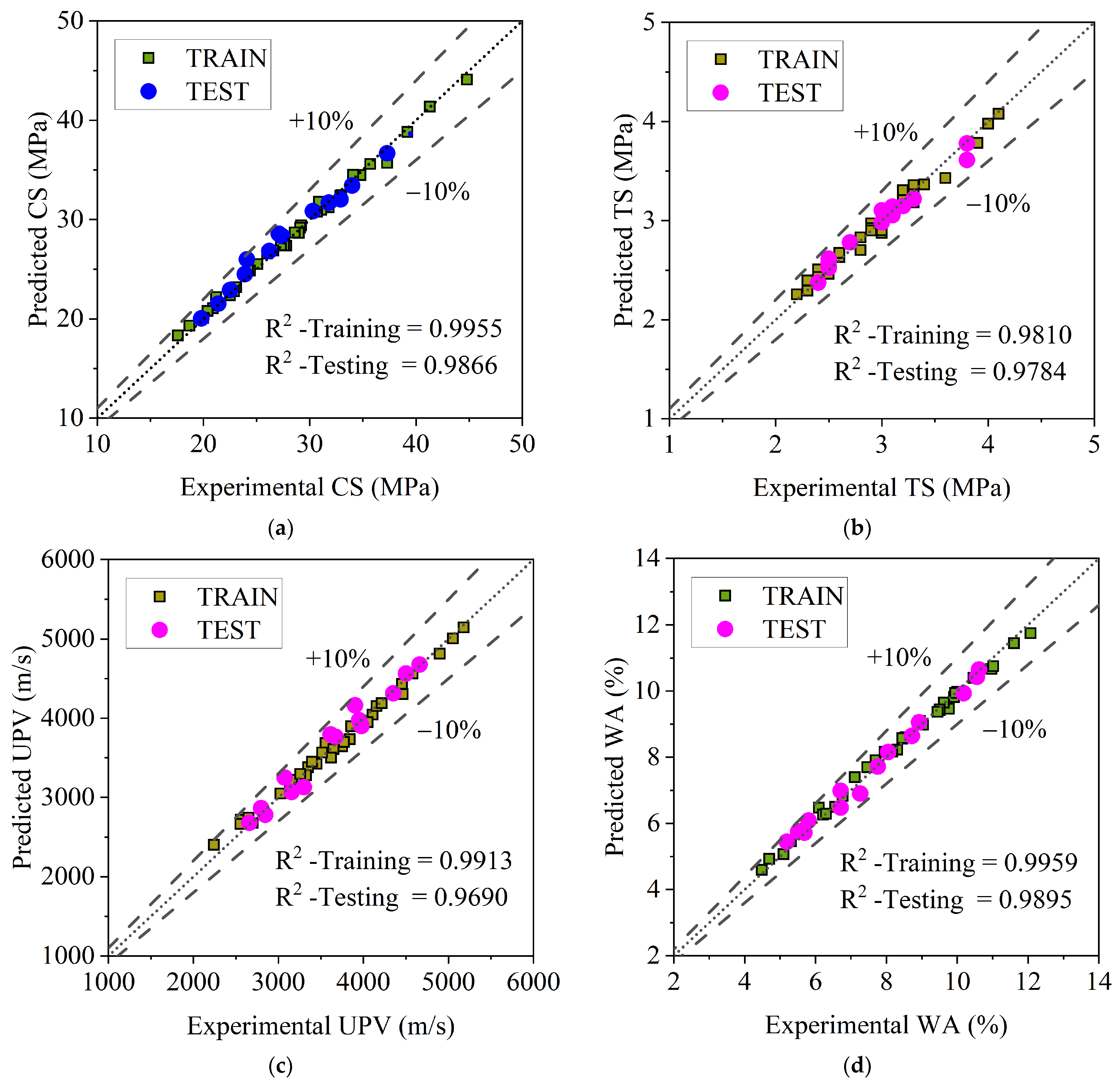 - Based on RF models’ results, MAPE values for CS, TS, UPV, and WA were (1.46, 2.01, 1.95, and 1.7%) for the train dataset, and (2.53, 2.23, 2.74, and 2.51%) for the test dataset. This means that all the prediction models had error rates of less than 5%.