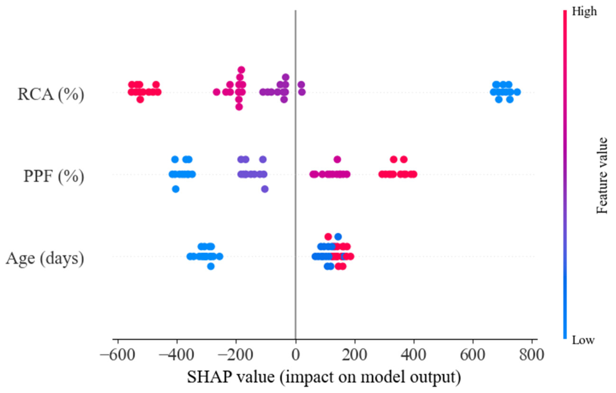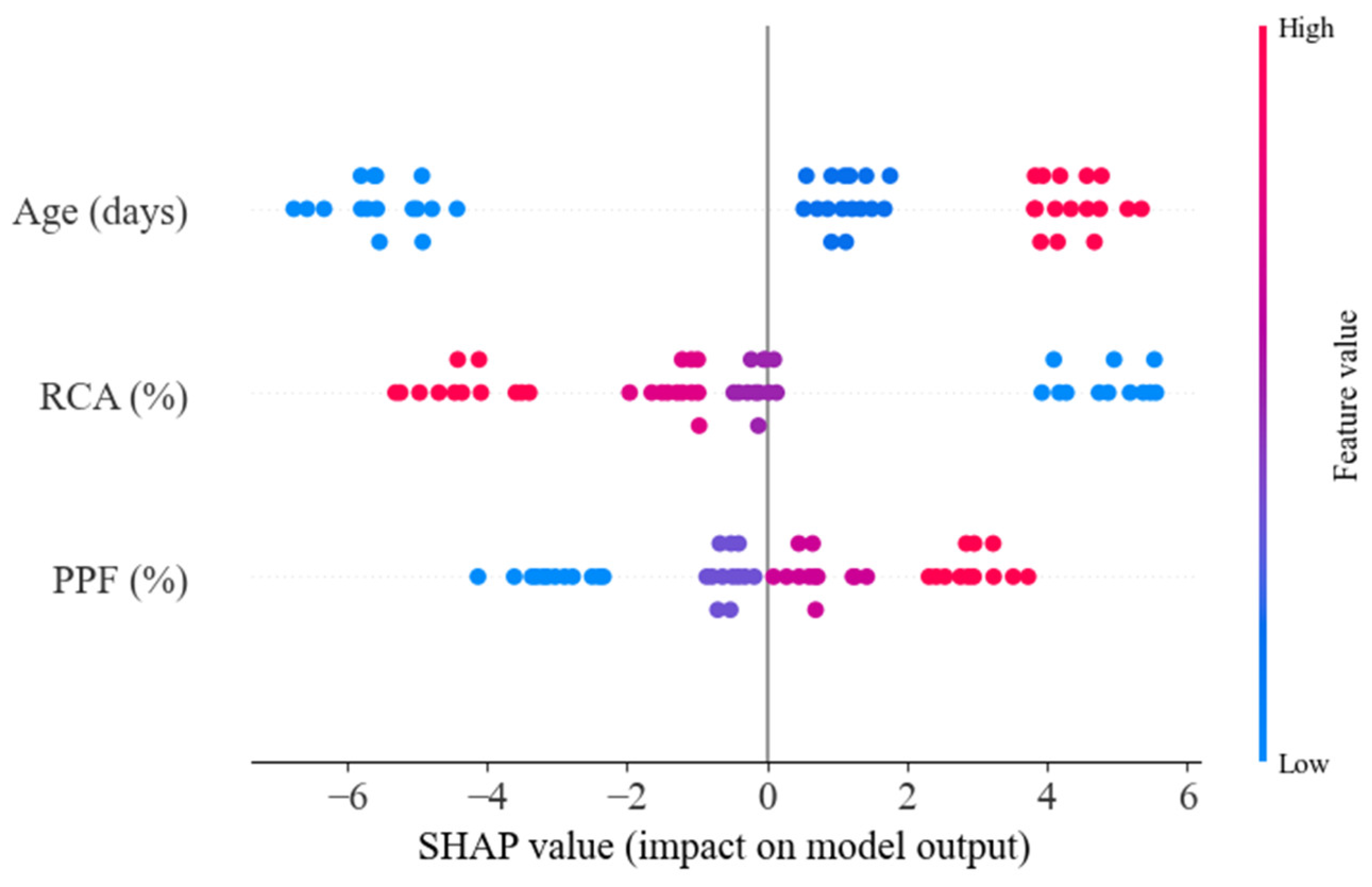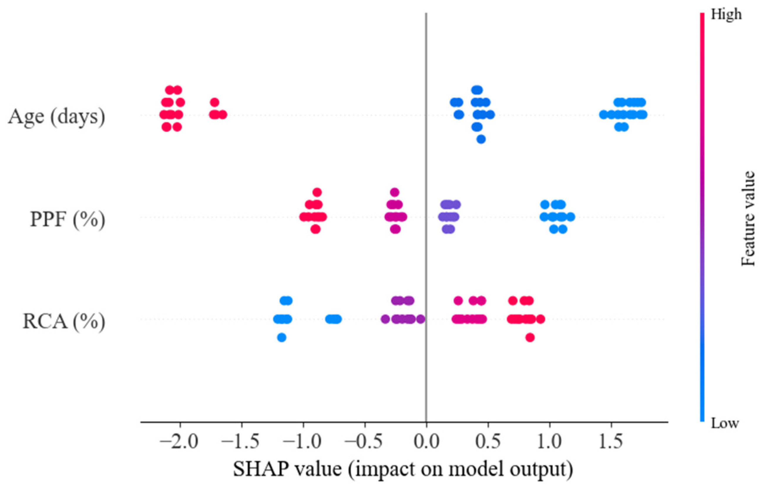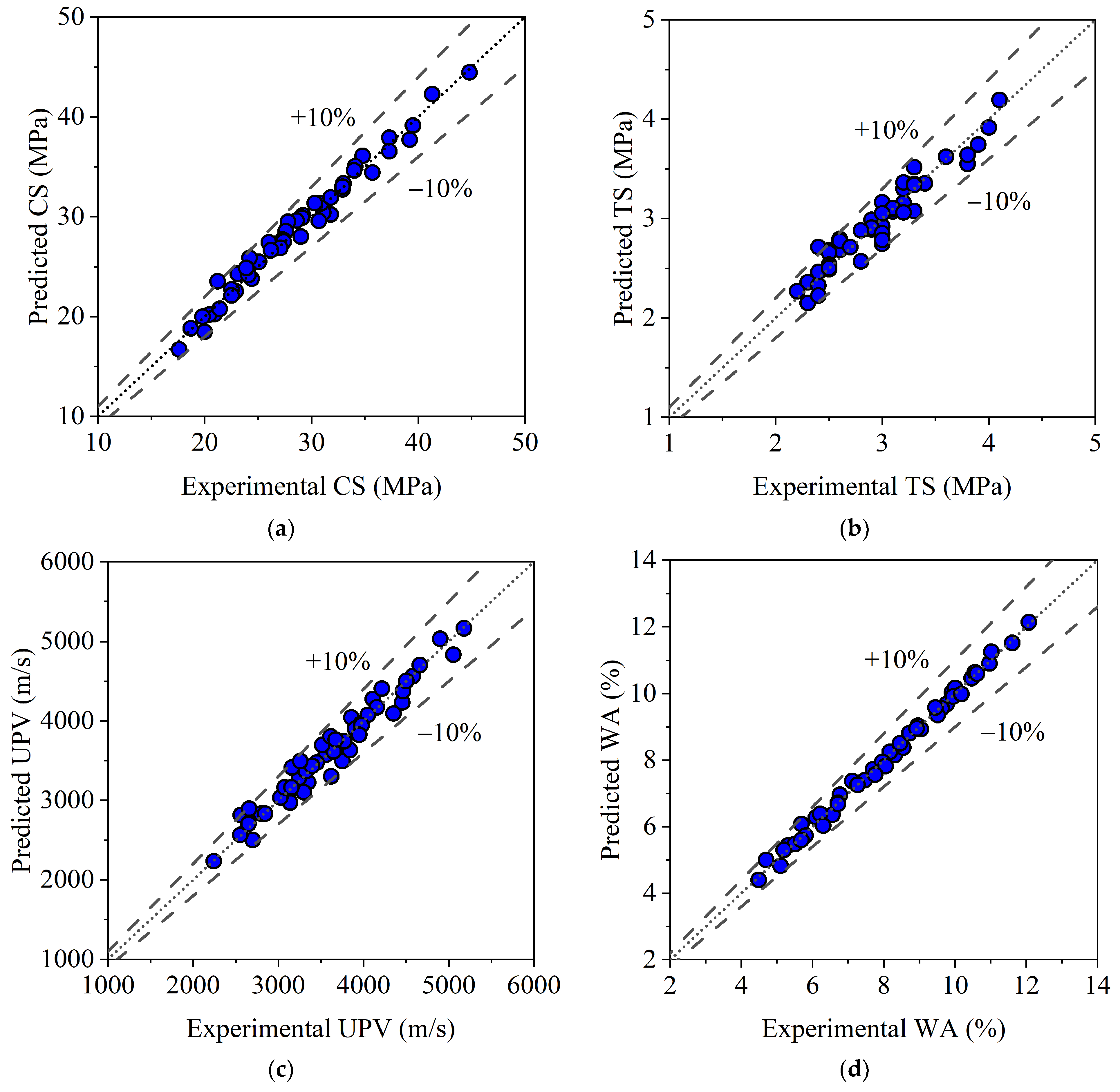 - The SHAP analyses demonstrate that curing age is the dominant factor influencing CS, UPV, and WA, demonstrating its critical role in microstructural development. In contrast, TS is primarily governed by RCA and PPF content. These distinct feature importance patterns underscore the need for property-specific optimization strategies when designing sustainable concrete containing recycled materials.
