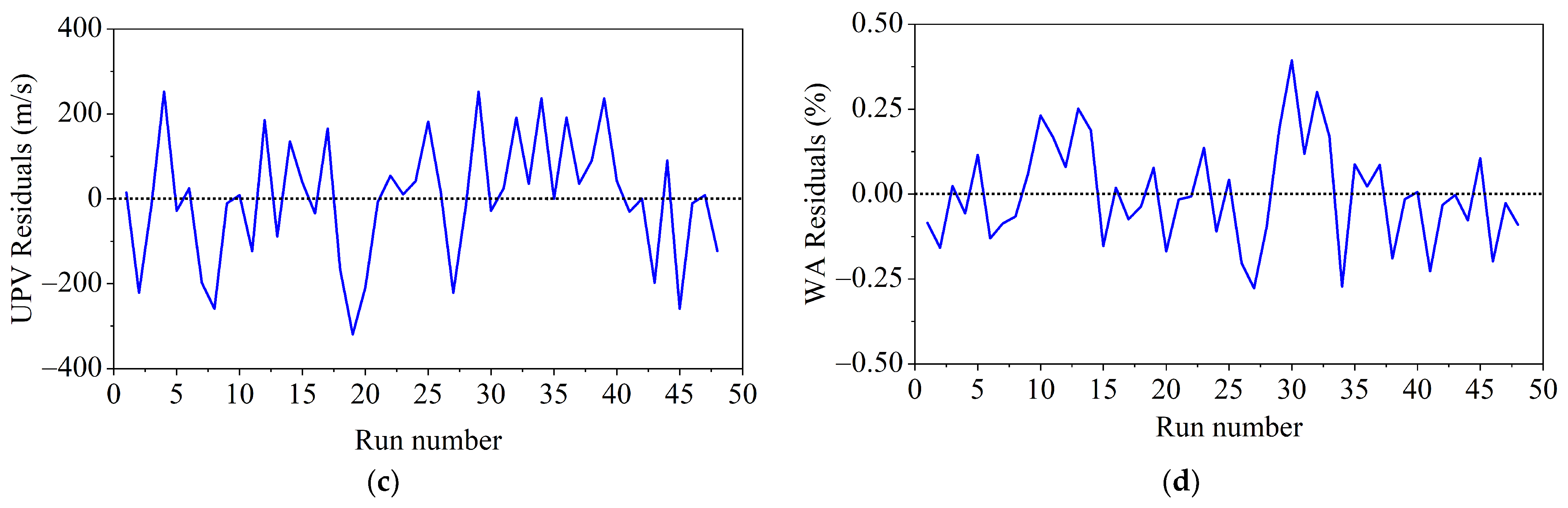 - The regression models developed for predicting the engineering characteristics of RCA-concrete containing PPF exhibited R2 values of 0.9803, 0.9234, 0.9569, and 0.9943 for CS, TS, UPV, and WA, respectively. These models demonstrated adequate precision (64.781, 37.540, 54.238, and 125.86) and p-values below 0.05, indicating a high level of correlation.