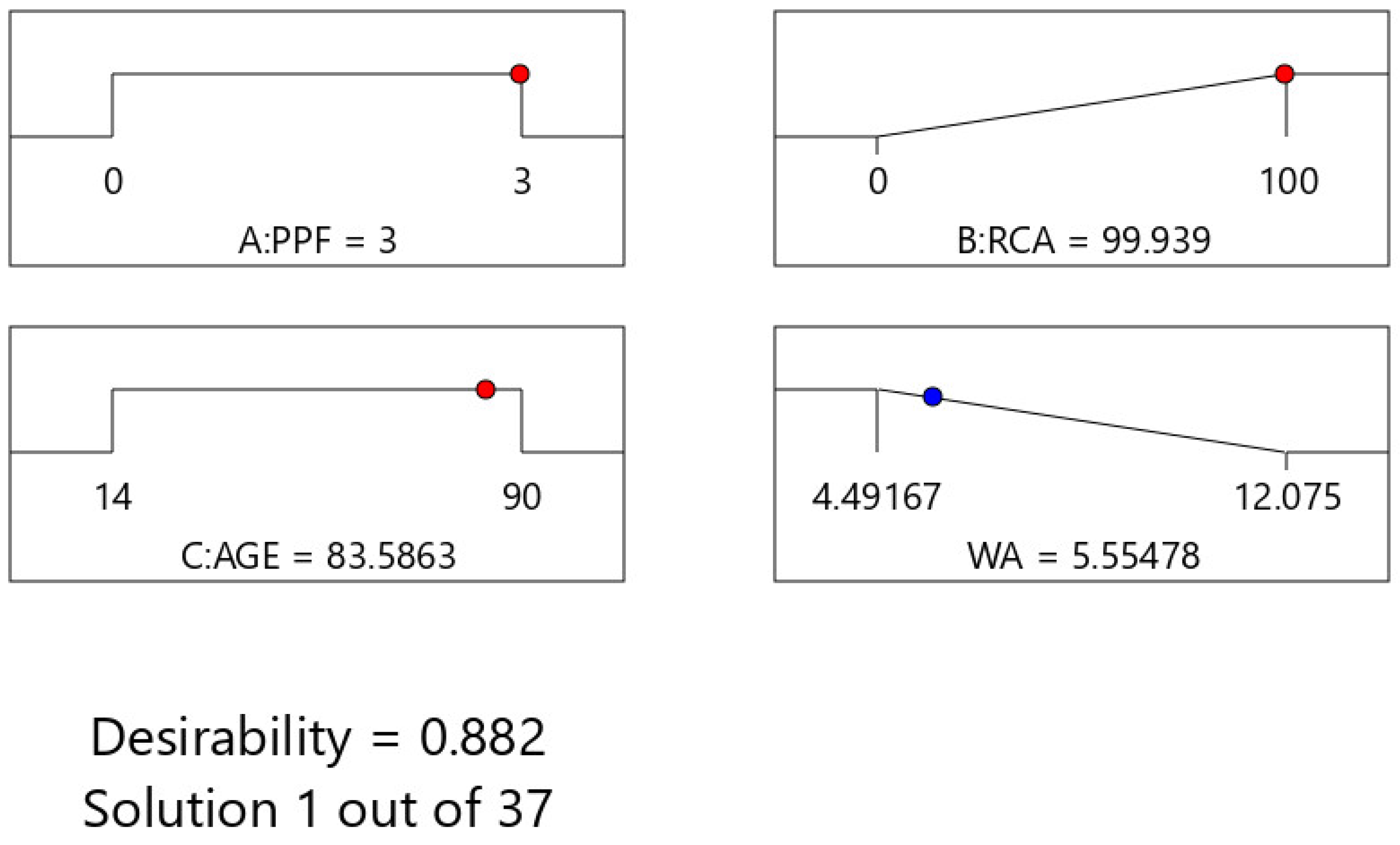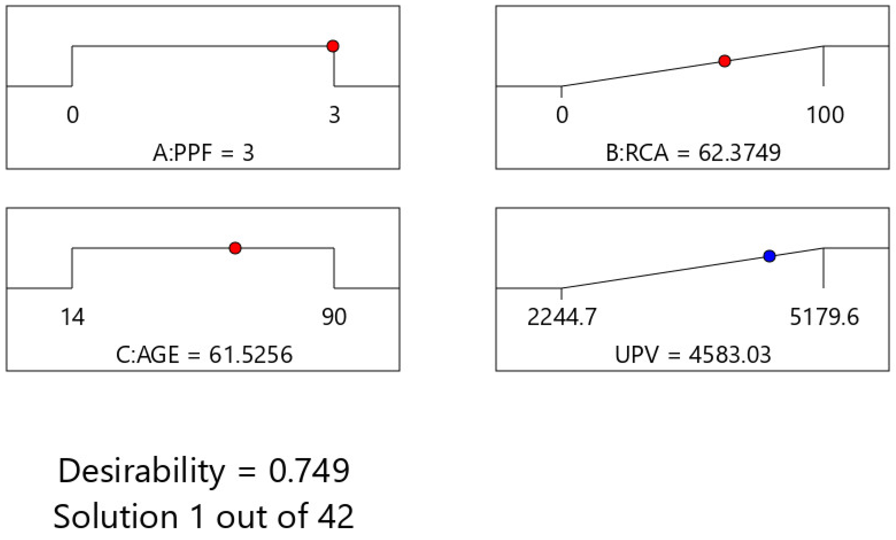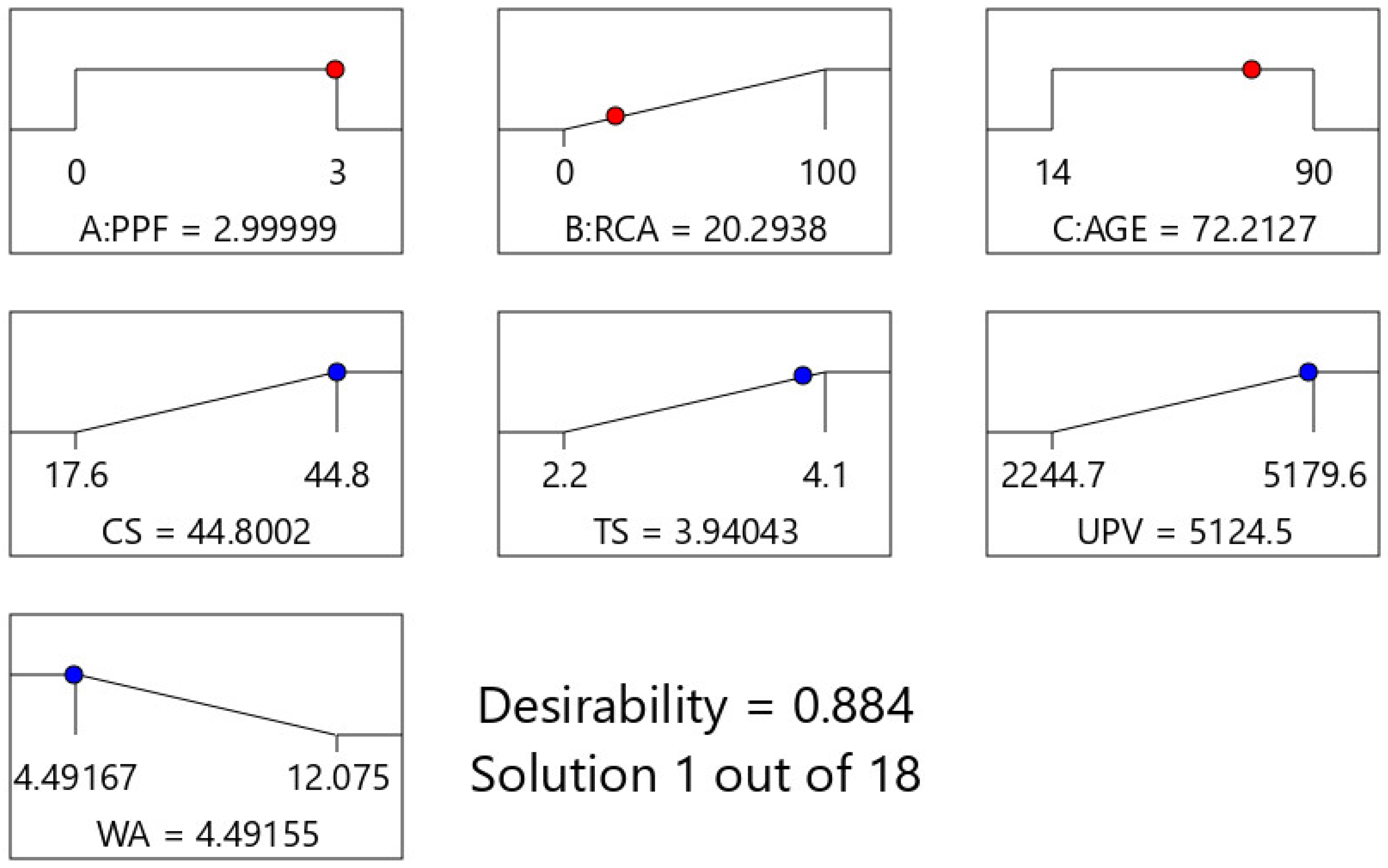 - The optimal conditions for all responses were achieved at a PPF of 3% by volume of concrete, an AGE of 83.6 days, and a near-maximum RCA value of 100%, highlighting optimal reuse of recycled aggregate with an overall desirability of 0.882.