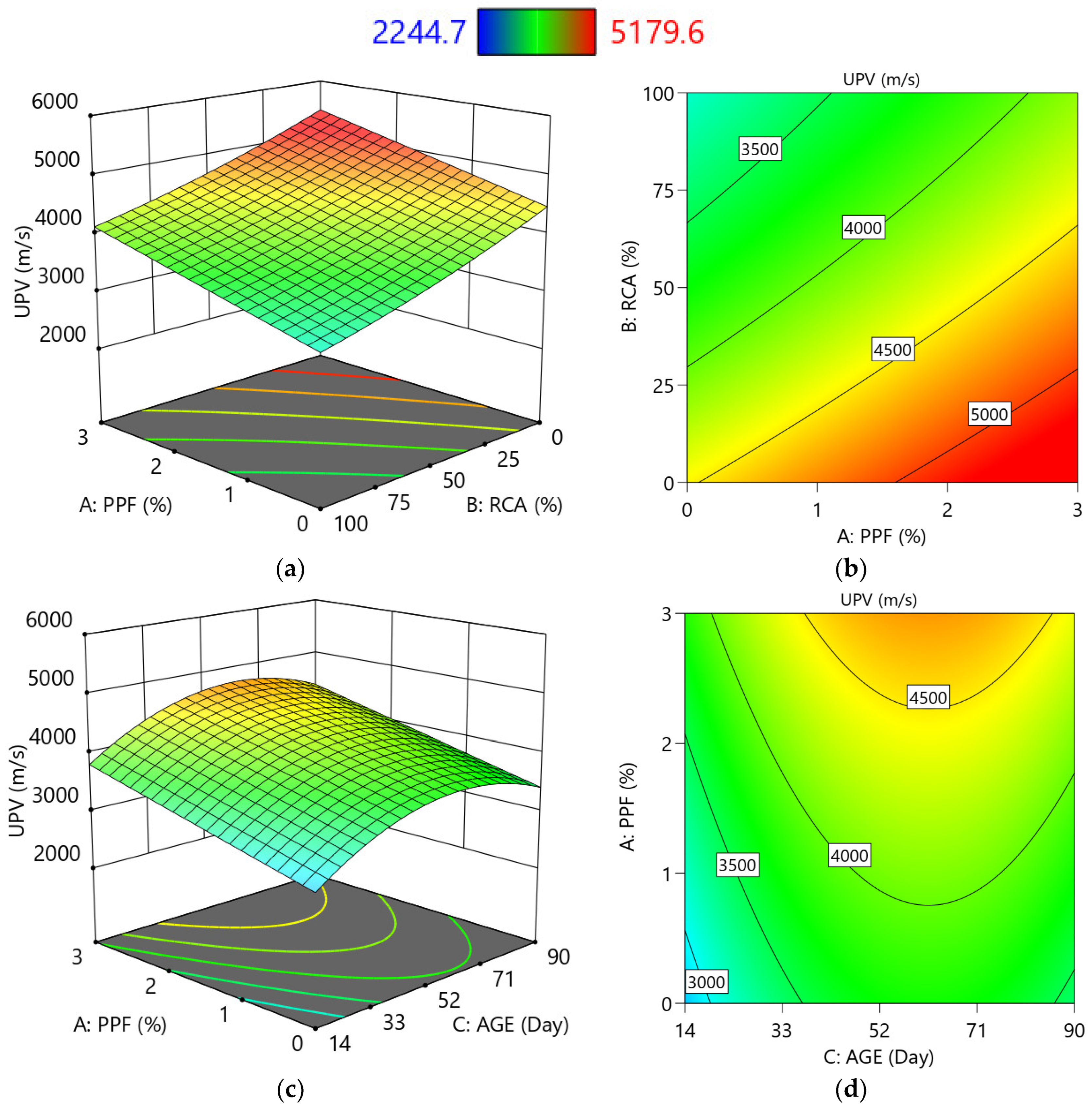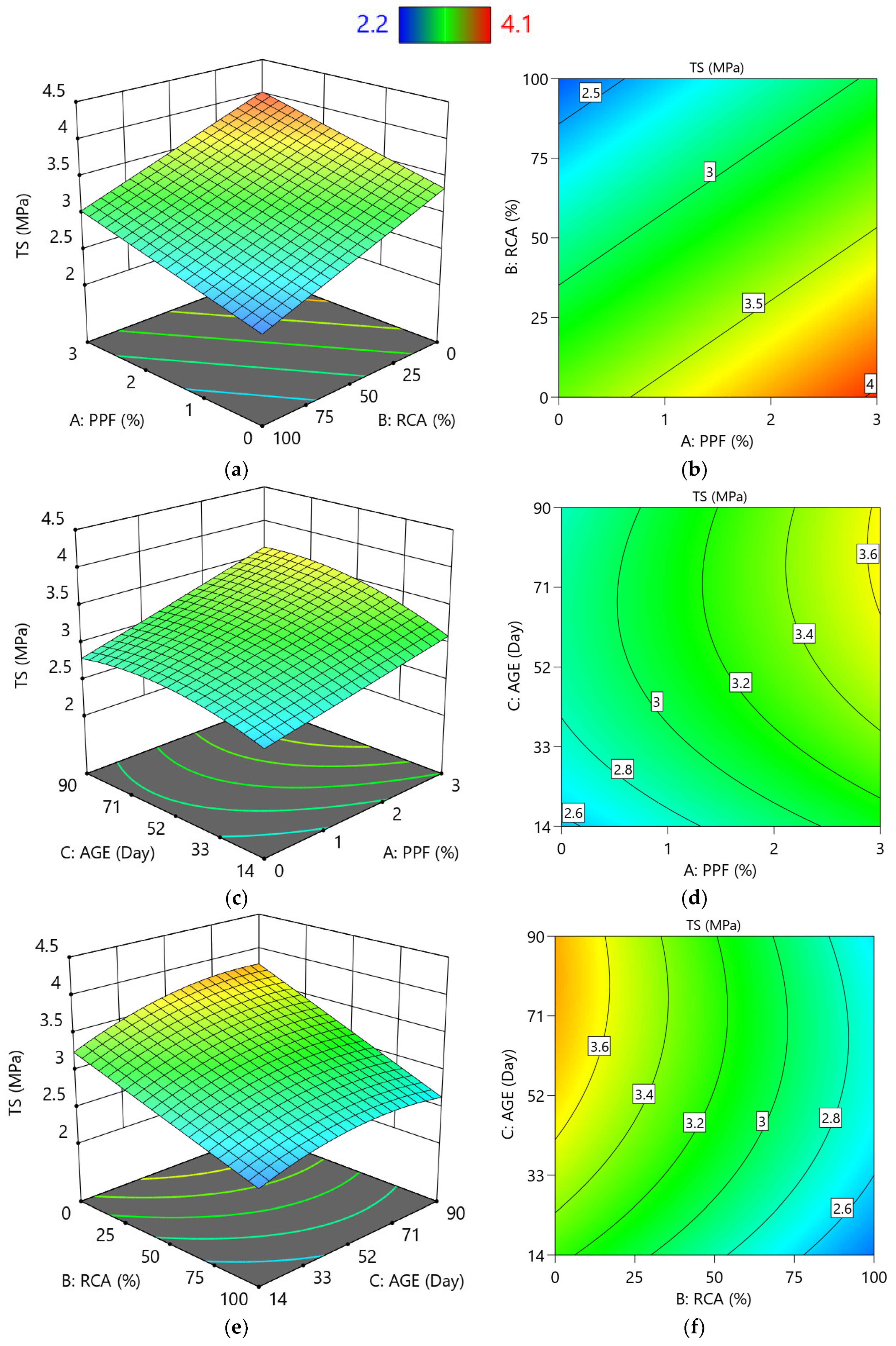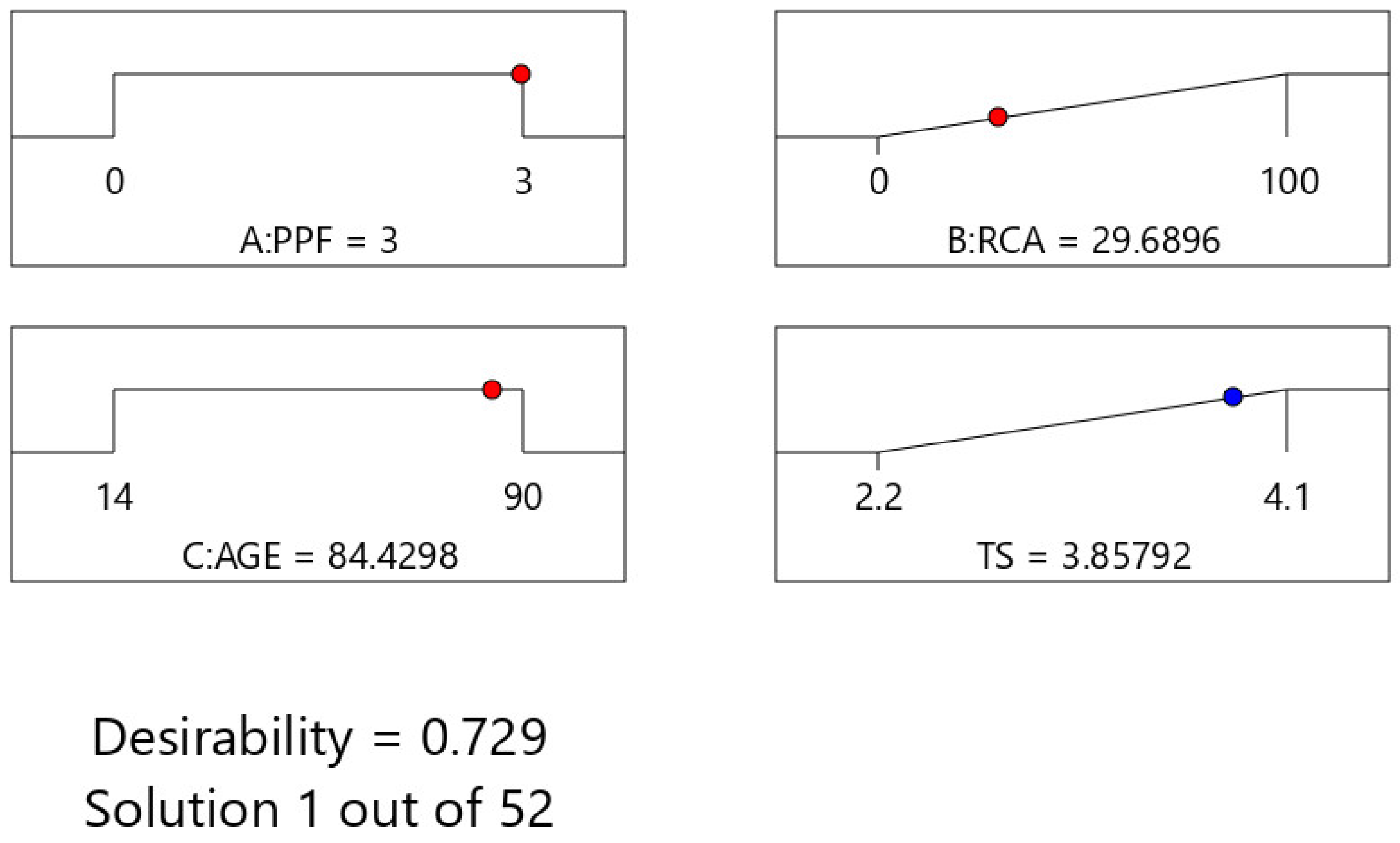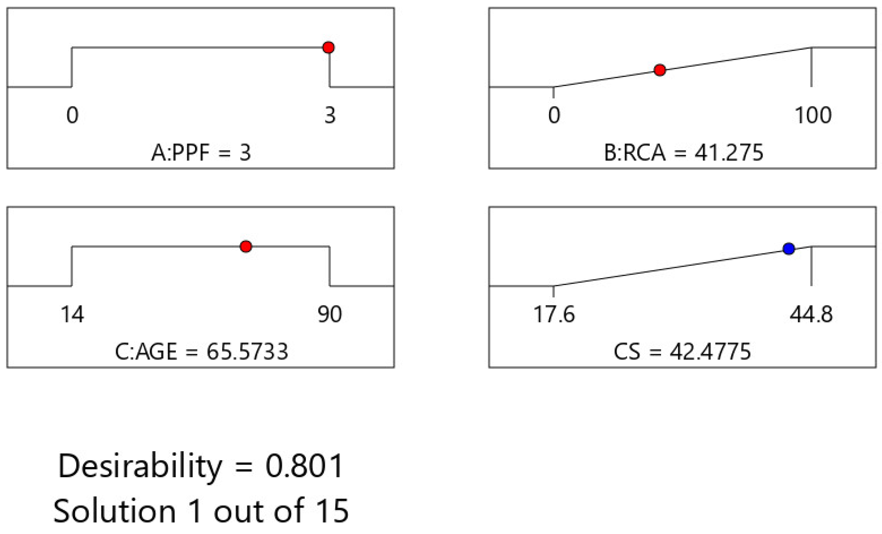 - The optimal conditions for all responses were achieved at a PPF of 3% by volume of concrete, an AGE of 83.6 days, and a near-maximum RCA value of 100%, highlighting optimal reuse of recycled aggregate with an overall desirability of 0.882.