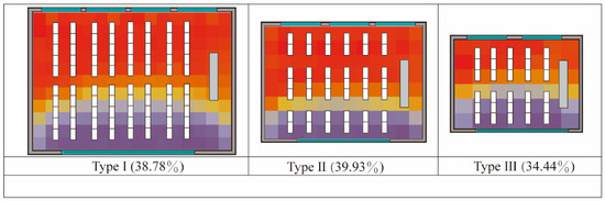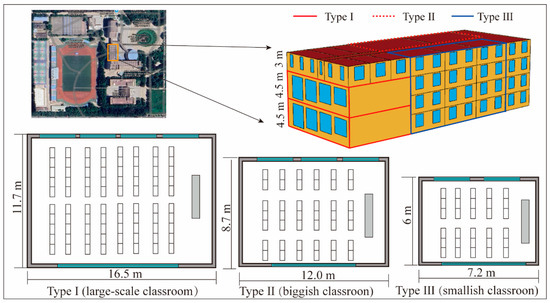University educational buildings in China typically consist of 4–6 stories with a floor height of approximately 3.8 m, and the window-to-wall ratio is 0.4 [42]. Classrooms are usually arranged linearly along corridors and stacked vertically. To ensure both representativeness and simplicity, three typical classroom types were selected as case studies (Figure 1), representing different spatial scales. The three classroom types have the following geometric and functional characteristics: Type I (biggish terra classroom), 16.5 m × 11.7 m, typically used for large lectures with more than 100 students; Type II (biggish classroom), 12.0 m × 8.7 m, mainly used for regular courses with 50–70 students; Type III (smallish classroom), 7.2 m × 6.0 m, designed for seminars or small-group teaching, accommodating about 30 students. All classrooms were assumed to be equipped with desks, lighting, and air-conditioning systems, as well as large external windows to provide daylighting and natural ventilation.