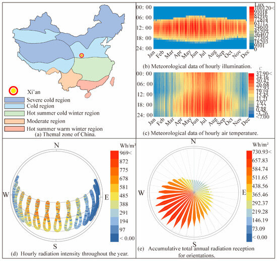 Climatic conditions of Xi’an: (a) thermal zoning of China; (b) hourly illuminance distribution; (c) hourly air temperature distribution; (d) hourly radiation intensity; (e) cumulative annual solar radiation by orientation.