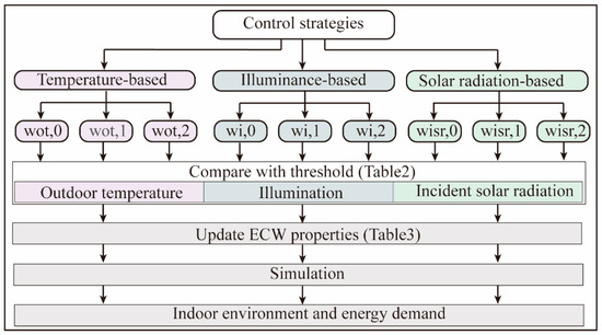 In this study, three types of ECW control strategies were designed, with their threshold conditions summarized in Table 2 and Table 3. The specific ranges of illuminance, incident solar radiation, and outdoor air temperatures used as control inputs were established with reference to threshold settings commonly adopted in previous studies [19,45]. The logic of ECW control strategies, including temperature-based, illuminance-based, and solar radiation-based modes, is illustrated in Figure 3.