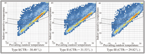 Thermal comfort was evaluated using the adaptive model, and the results are presented in Figure 5. Type I exhibited a CTRT of 30.40%, with most operative temperatures ranging from 20 to 30 °C. However, frequent overheating occurred during summer, indicating insufficient cooling capacity. Type II performed best, with a CTRT of 31.53%. Its operative temperature distribution was more concentrated during transitional seasons, with a slightly higher proportion of hours within the comfort zone compared with Types I and III. Type III had the lowest CTRT of 29.82%.