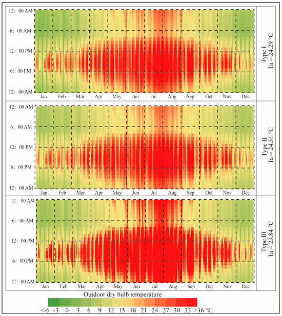 Figure 6 illustrates the hourly indoor temperature distribution of the three classrooms. In general, indoor temperature trends followed seasonal outdoor variations, yet differences in absolute values and ranges were evident. Type I had an annual mean indoor temperature of 24.29 °C. During the summer (June–September), temperatures frequently remained between 27 and 33 °C, indicating overheating risks, while in the winter (December–February), temperatures decreased to 6–12 °C, suggesting insufficient insulation. Type II showed a slightly higher annual mean indoor temperature of 24.51 °C. Although summer overheating was also observed, its winter temperature distribution was more concentrated in the range of 9–15 °C, demonstrating a buffering effect. Type III exhibited the lowest mean indoor temperature of 23.84 °C, with a polarized distribution: summer overheating (>30 °C) was evident, while in winter, prolonged low temperatures of 6–10 °C were dominant, resulting in inadequate thermal comfort.