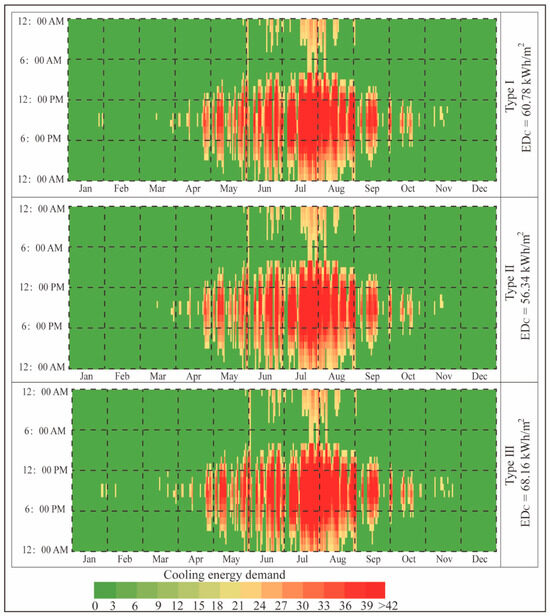 Figure 7 shows the annual cooling demand distribution. Cooling was concentrated in summer, with July and August contributing the highest loads. Type I had an EDC of 60.78 kWh/m2, with peak demands in July, indicating significant summer overheating. Type II again performed best, with the lowest cooling energy use of 56.34 kWh/m2. Although its seasonal pattern was similar to Type I, the overall level was lower, demonstrating greater effectiveness in reducing summer cooling loads. By contrast, Type III consumed the most cooling energy, with an annual intensity of 68.16 kWh/m2. Its cooling demand not only peaked in July–August but also extended over a longer duration, indicating severe overheating and the least favorable cooling performance.