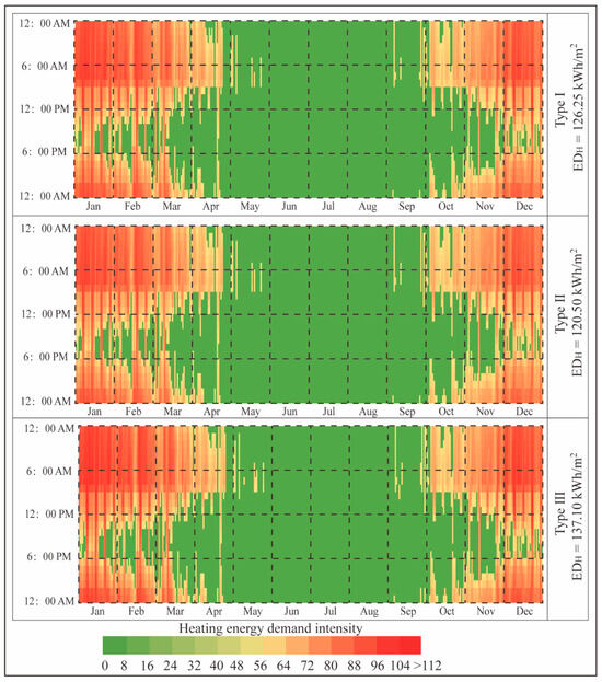 The annual heating demand of the three classrooms is shown in Figure 8. Heating was primarily required during the winter season, peaking in December and January, with negligible demands in the summer. Type I had an annual heating energy use intensity EDH of 126.25 kWh/m2, with particularly high loads in December and January, indicating a strong reliance on heating. Type II recorded the lowest heating energy use of 120.96 kWh/m2, following a similar seasonal pattern but at a slightly lower overall level, suggesting that its layout offers some advantage in reducing heating demands. Type III exhibited the highest heating energy use of 137.10 kWh/m2, with longer heating periods, especially from January to February, highlighting its poor thermal performance.
