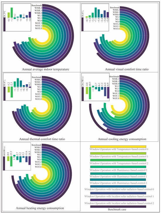 Regarding energy performance, the benchmark annual cooling energy use was 125.3 kWh/m2. ECW controls reduced cooling demands by −1.0% to −10.5%. The illuminance-based strategy WIL.2 achieved the greatest reduction, followed by WISR.2, both showing advantages in mitigating excessive summer solar gains. Annual heating energy use was 60.9 kWh/m2 under the benchmark case. All strategies reduced heating demands, with decreases of −3.2 to −11.6 kWh/m2. The temperature-based control WOT.0 achieved the best result, indicating its strong ability to enhance passive solar gains and reduce winter heating loads.