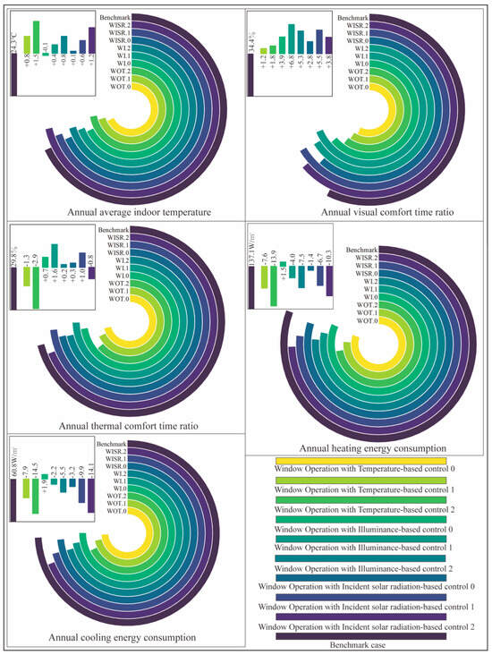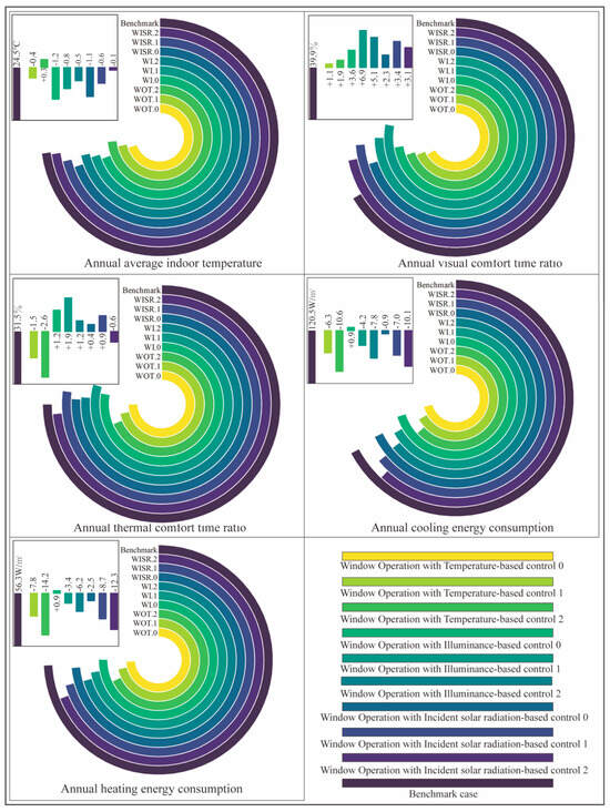 Figure 10 presents the five key performance indicators of the medium classroom under the benchmark case and different ECW control strategies. Compared with the large classroom, the medium classroom exhibited distinct characteristics in indoor environmental improvements and energy optimization.