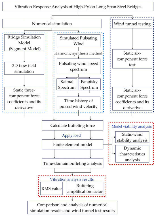 Accordingly, under the same target spectrum and the same full-bridge FE model, we construct two parallel routes for comparison—a “3F 3-D numerical time-domain analysis” and a “6F 3-D sectional wind tunnel time-domain analysis.” Using the Youlian Honghe Grand Bridge as the engineering case, we build a full-bridge FE model for the construction stage and generate/validate the turbulent wind field against the target spectrum [19]. Time-domain buffeting analysis is then carried out with three-component aerodynamic coefficients and their angle-of-attack derivatives obtained from 3D numerical simulation; in parallel, six-component coefficients and derivatives are measured on a 3D sectional model in the wind tunnel and introduced to the time-domain computation, thereby explicitly incorporating force–moment coupling and angle-of-attack sensitivity. The 6F-based results are compared side-by-side with the 3F framework [24], with the aim of delivering a reusable experimental–computational pathway for the wind resistance assessment and design verification of similar bridges. The technical workflow of this study is shown in Figure 1.