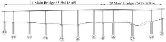 This study focuses on the main bridge of the Youlian Honghe Bridge, located in a valley terrain and classified as a tall-pier, long-span continuous rigid-frame bridge. Within the corridor’s control works, the entire bridge measures approximately 2161 m in length and features the largest span and tallest piers along the Sanyuan to Yiyang section of the Yinkun Expressway. The superstructure of the main bridge adopts two continuous rigid-frame units of prestressed concrete with variable depth, a single-box single-cell cross-section, and an integral deck. The span arrangement is (65 + 5 × 118 + 65) m + (76 + 2 × 140 + 76) m, giving a total main bridge length of about 1152 m (see Figure 2).