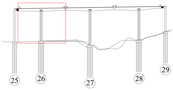 Main Bridge 2# (76 + 2 × 140 + 76 m). The box girder depth is 8.4 m at the pier and 3.2 m at midspan, also varying along the span following a parabolic law of order 1.8. Piers 26–28 adopt twin-leg rectangular hollow thin-walled sections with a wall thickness of 0.70 m, single-leg thickness of 3.0 m, lateral width 7.75 m, and a clear spacing between legs of 4.0 m. To improve lateral load transfer, the girder–pier junction is widened by 0.5 m on each side, and the foundation uses an integral pile cap. The No.29 transition pier is a rectangular hollow thin-walled section (7.75 m transverse × 5.0 m longitudinal) supported on a separate pile cap (see Figure 3 and Figure 4).