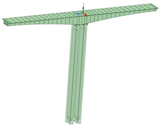 To match the critical construction condition, we select the Main Bridge 2-Pier 26 control unit as the evaluation case (As shown in the dotted box in Figure 3). The girder length of this unit is 145.16 m: on the side-span side, 19 cantilever segments are arranged (closure segment 1.0 m), and on the midspan side, 18 segments are arranged (cast-in-place segment 4.16 m). The girder has a variable depth, with a minimum depth hmin = 3.2 m and a maximum depth hmax = 8.4 m. Based on the above geometry and boundary conditions, a 3D simulation model is established in Ansys Workbench (see Figure 5), and the same reference quantities and coordinate conventions are used consistently in the subsequent finite-element analysis and wind tunnel comparisons.