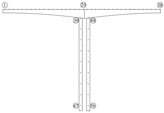 In this study, wind-induced vibration is evaluated using numerically simulated fluctuating wind histories. A site-specific turbulent wind field is built for the Youlian Honghe Bridge, and wind speed time series are generated at multiple locations on the main girder and main pier. Along the girder, 38 points are arranged by construction segment; along the pier, 9 points are placed at equal vertical intervals (Figure 6). The design wind speed is 28 m/s. Fluctuation target spectra follow the Code for Wind-Resistant Design of Highway Bridges [19], and the key simulation parameters are listed in Table 1.