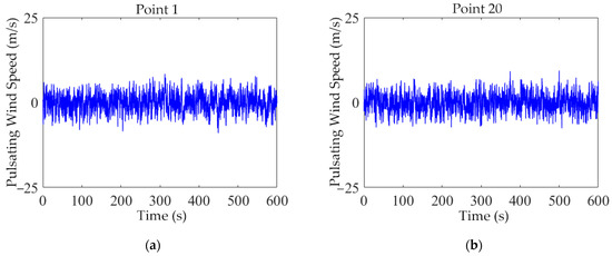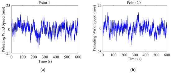 Along-wind fluctuating wind time history: (a) along-wind fluctuating wind time history at Point 1; (b) along-wind fluctuating wind time history at Point 20.