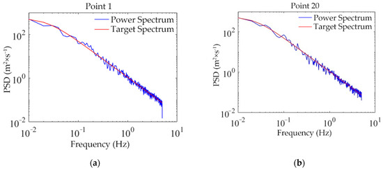 Meanwhile, to validate the simulations, the fluctuating wind PSDs at each measurement point are compared with the target spectra; the fits for Points 1 and 20 are shown in Figure 9 and Figure 10.