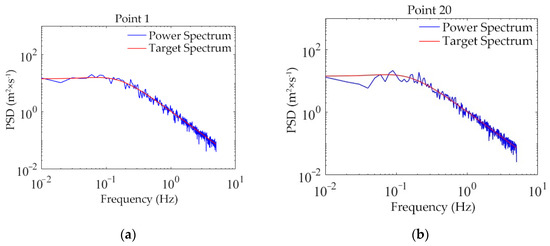 Target-spectrum fitting of the along-wind component: (a) target-spectrum fit for along-wind PSD at Point 1; (b) target-spectrum fit for along-wind PSD at Point 20.