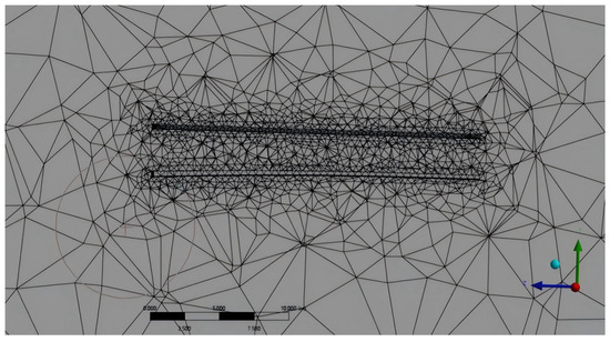 Accordingly, a rectangular external domain is adopted with the inlet 4L upstream of the windward face, the outlet 8L downstream of the leeward face, and the top/bottom boundaries 4H away from the model. The overall domain size is 400 m × 300 m × 80 m, giving a blockage ratio of 2.9%, which satisfies the guideline. Meshing uses near-body refinement around the section (minimum cell size 0.5 m) and coarsening toward the far field (typical cell size 10 m), with smooth size transitions; a local mesh view is shown in Figure 12.